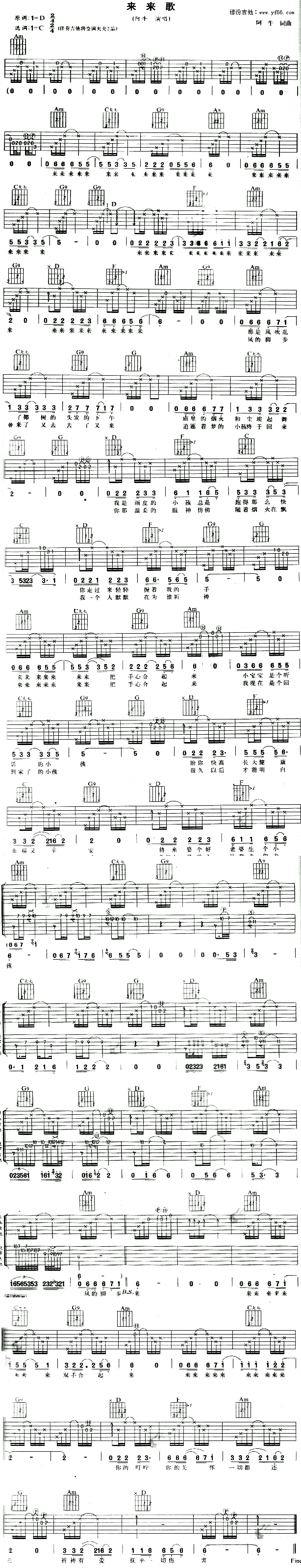 来来歌吉他谱 - 阿牛 - C调吉他弹唱谱