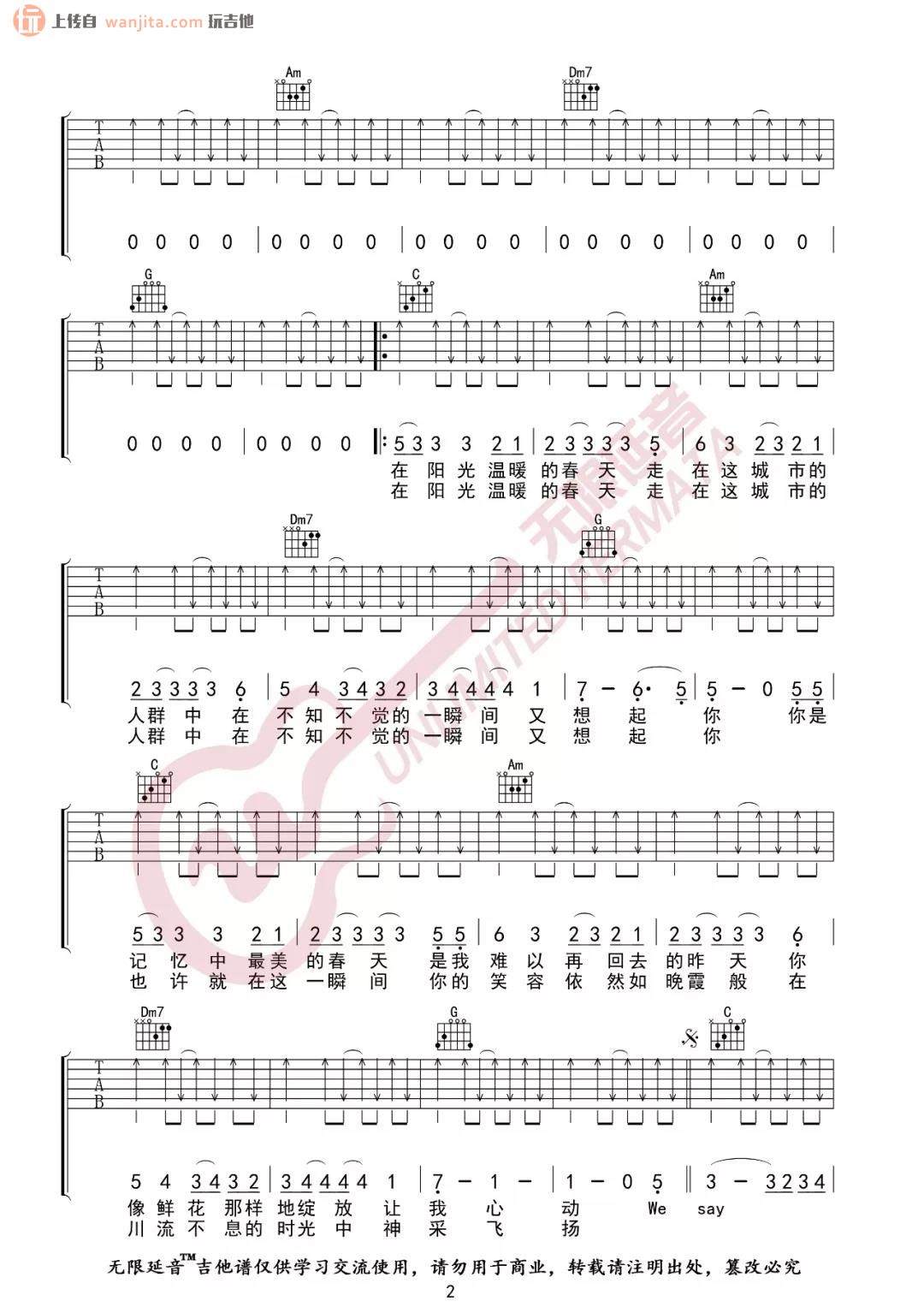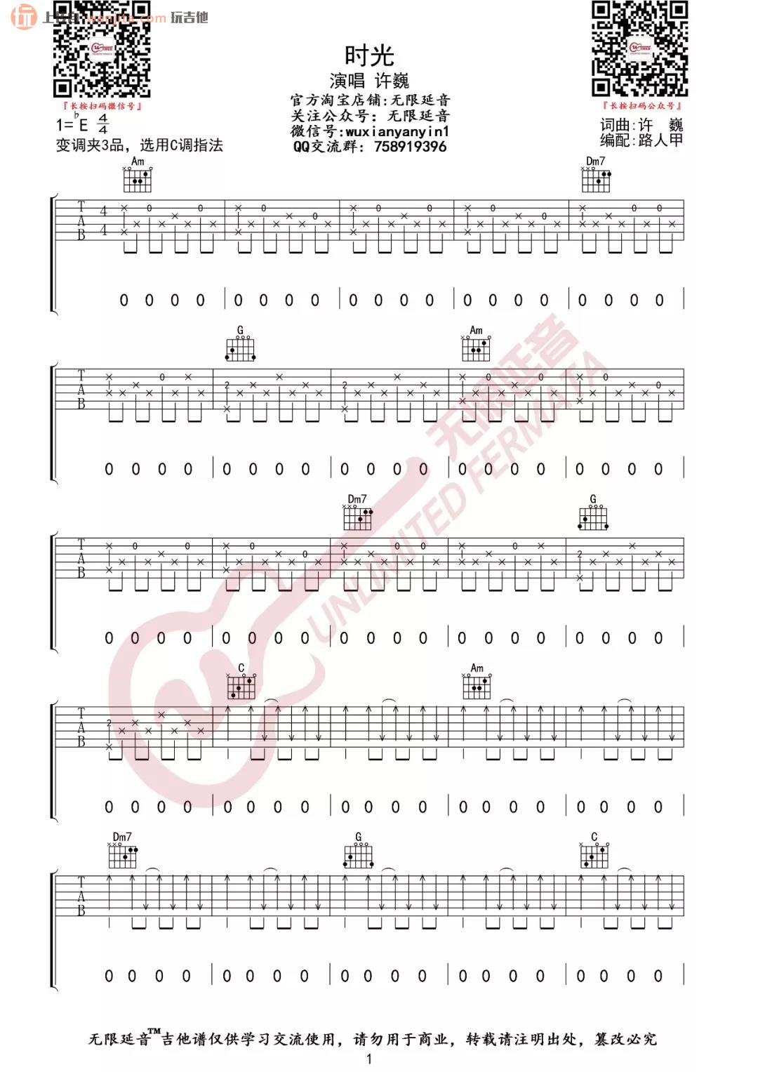 曲谱介绍: 《时光》吉他谱由无限延音提供分享 ,原调是bE调,选用了C调指法,变调夹夹3品,这首谱子包含了超长的前奏,分解和弦弹唱,主歌部分由扫弦弹唱。