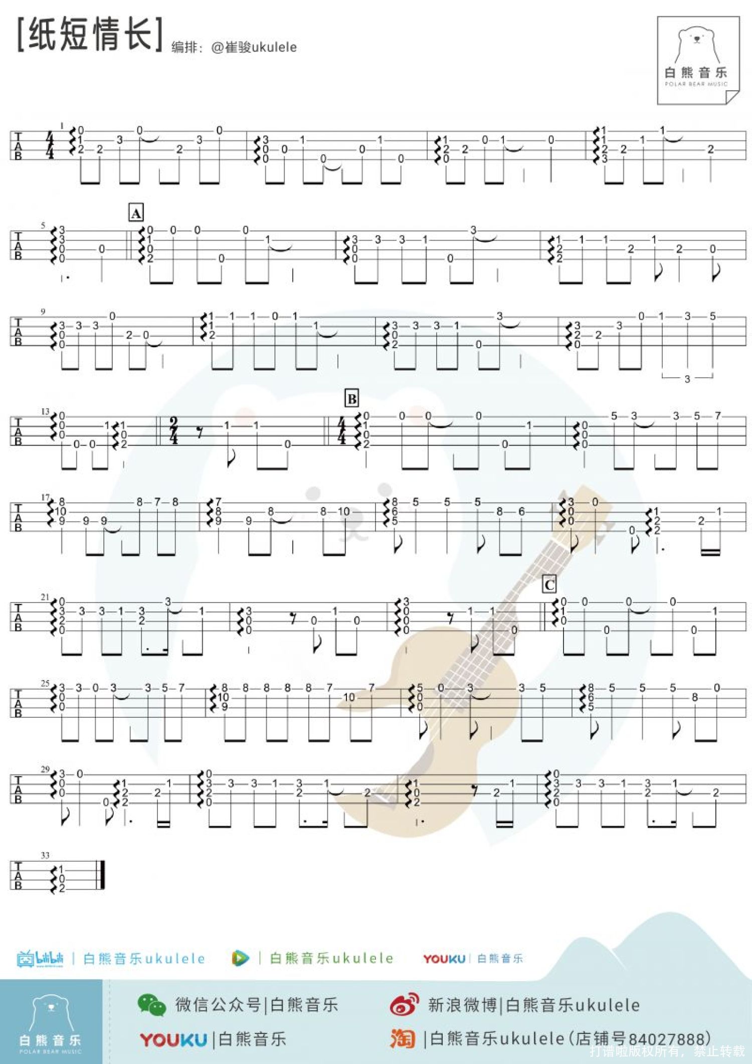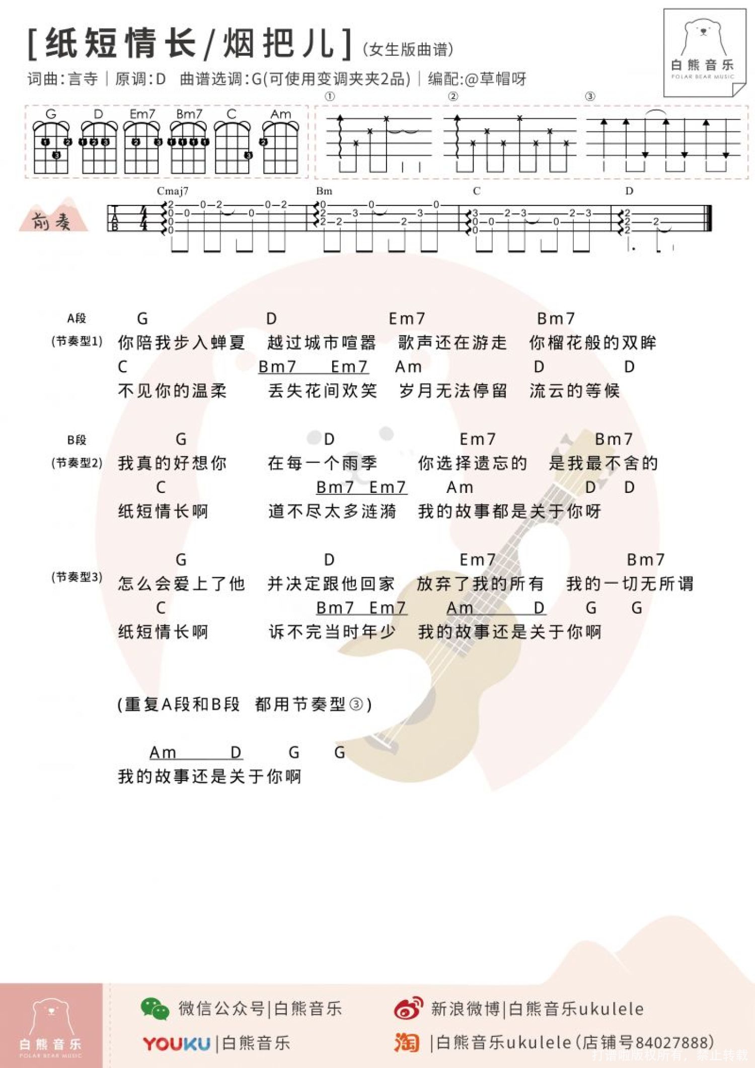 曲谱介绍: "不成字,纸短情长,伏惟珍重" 简短的信纸写不完深长情意   1、弹唱演示|@草帽呀   2、指弹演示|@崔骏ukulele ——你说这个年代还有人写信吗? ——有啊,我一直给她写信,写情诗,写歌。 ——她是你的爱人吗? ——对呀,结婚了,和别人。 这首〈纸短情长〉,大概就是这么一个故事,一首写给前女友的情歌,纸短情长,但我的故事都是关于你啊。   指弹教学|@崔骏ukulele   弹唱教学|@草帽呀   曲谱 1、指弹谱   2、弹唱谱 演示版本 C调版本