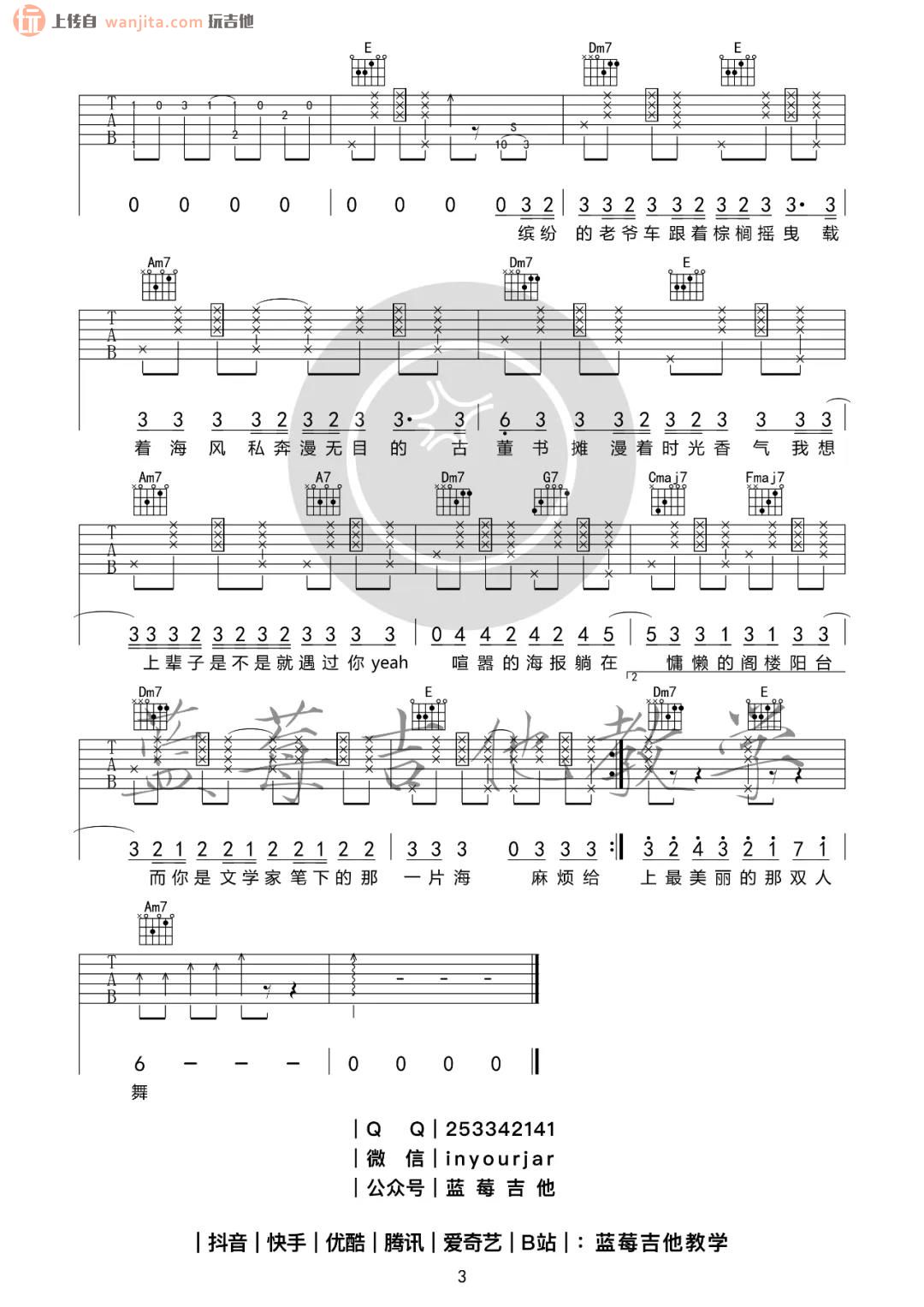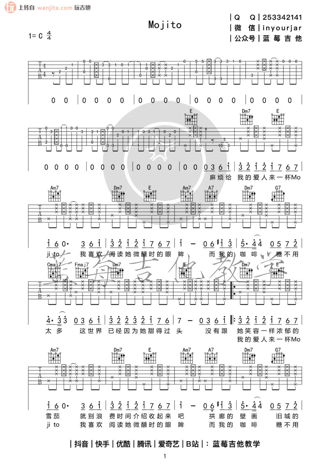 曲谱介绍: 周杰伦《Mojito》吉他弹唱谱,采用C调指法编配原版,共有3张高清图谱。