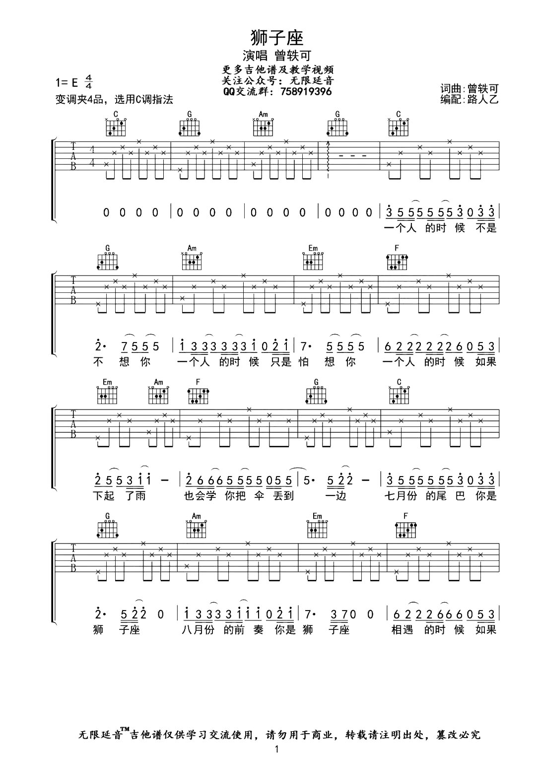 狮子座吉他谱 - 曾轶可 - C调吉他弹唱谱 - 原版