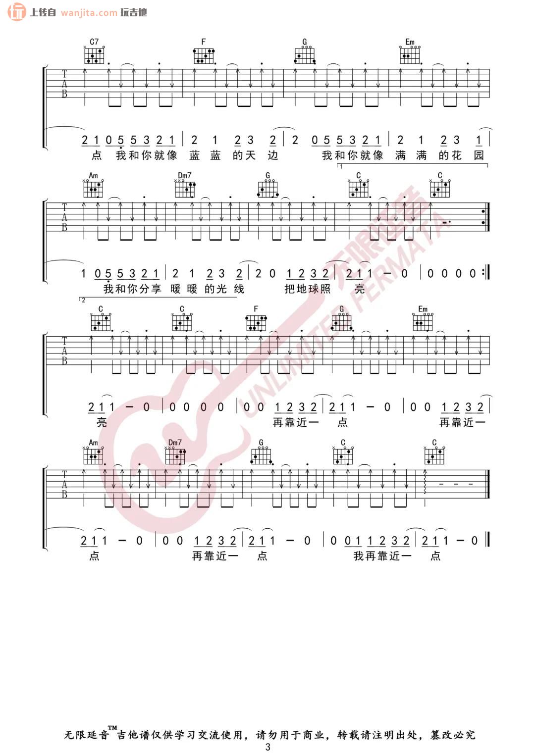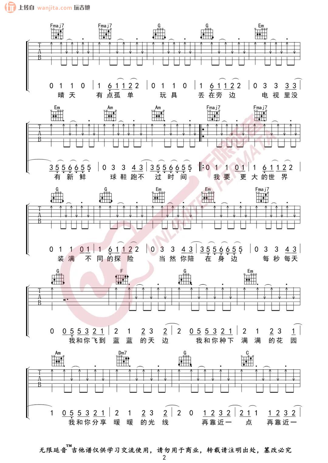 曲谱介绍: 《我和你》吉他谱,由无限延音编配,原调bE,选用C调指法,整首歌曲一开始就是扫弦的出场,不过滞音在这首歌中扮演重要的节奏,为了让扫弦更加有层次感,需要更好配合节奏来弹唱。