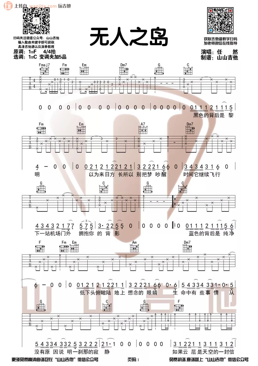 曲谱介绍: 《无人之岛》吉他谱由山山吉他分享提供编配,原调是F调,选用了C调指法,4/4拍,变调夹夹在五品之处,这个版本是按照原版去扒带的,下方有吉他弹唱的示范视频,大家可以提前试听参考,喜欢的朋友可以练练哦,很好听。 《无人之岛》吉他弹唱视频教学
