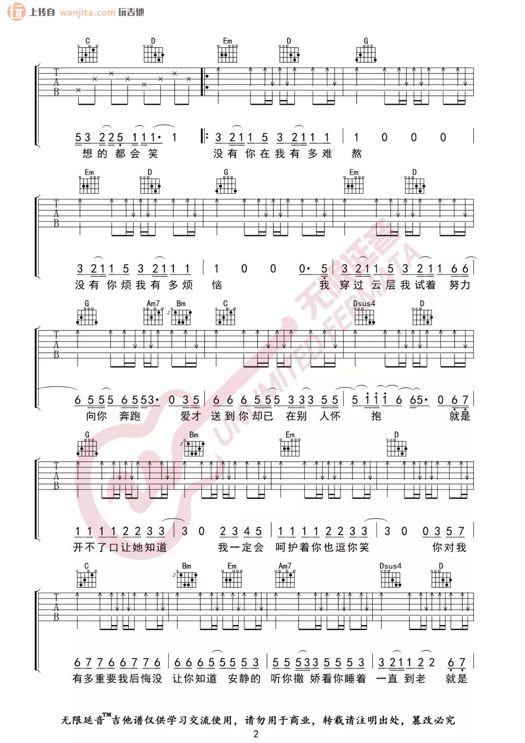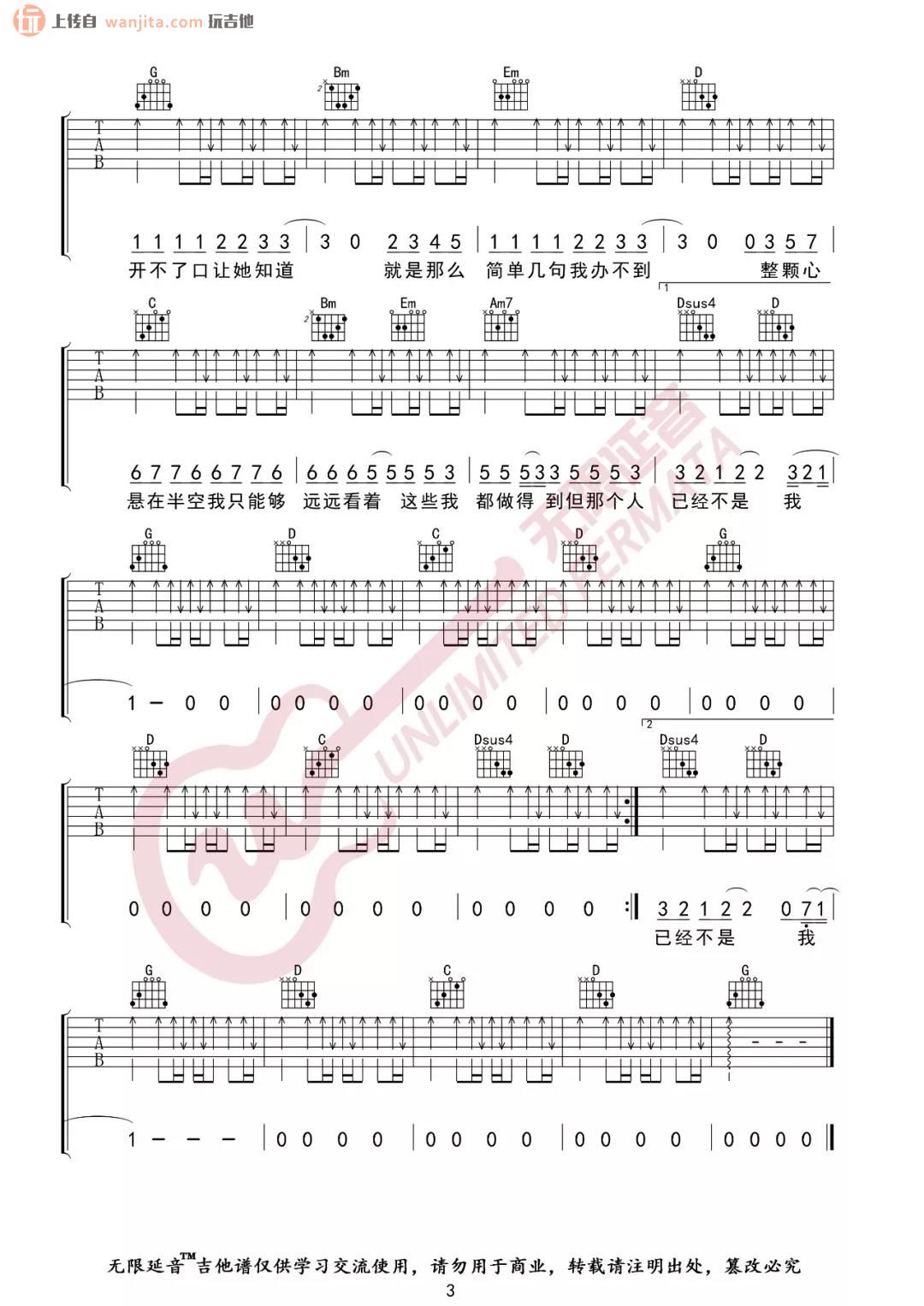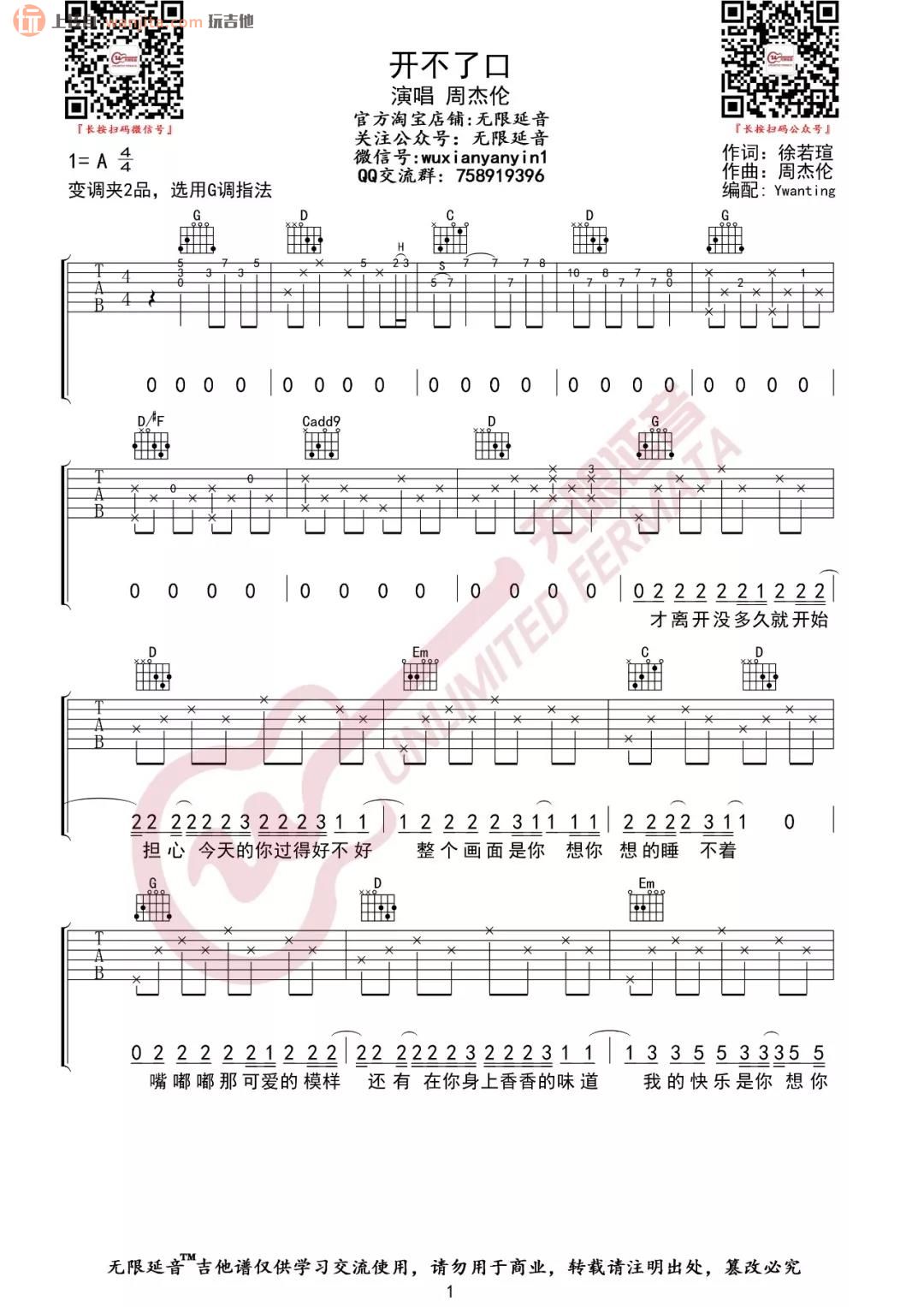 曲谱介绍: 《开不了口》吉他谱,原调是A调,无限延音选用G调指法编配分享,变调夹可以夹2品,总共有3张高清图片谱,算是简单版,不过包含了基本的前奏,对于新手来说也不简单,主副歌弹唱起来不算难,喜欢的朋友可以收藏练习哦。
