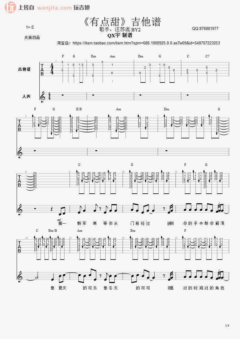 曲谱介绍: 《有点甜》吉他谱,由网友QX宇提供分享,原调是E调编配,谱子有说明,作者是选用的C调指法编配,变调夹可以夹4品,全曲主要以扫弦弹唱节奏为主,所以和弦难度不大,主要是掌握好扫弦节奏。
