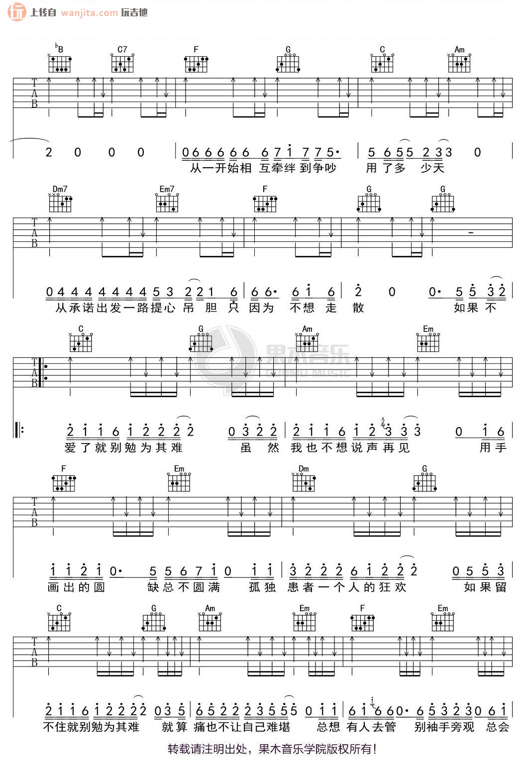 曲谱介绍: 《勉为其难》吉他谱,选用C调编配,这首歌曲主要部分以扫弦为主,所以扫弦的基本就是一定要把节奏感把握好。