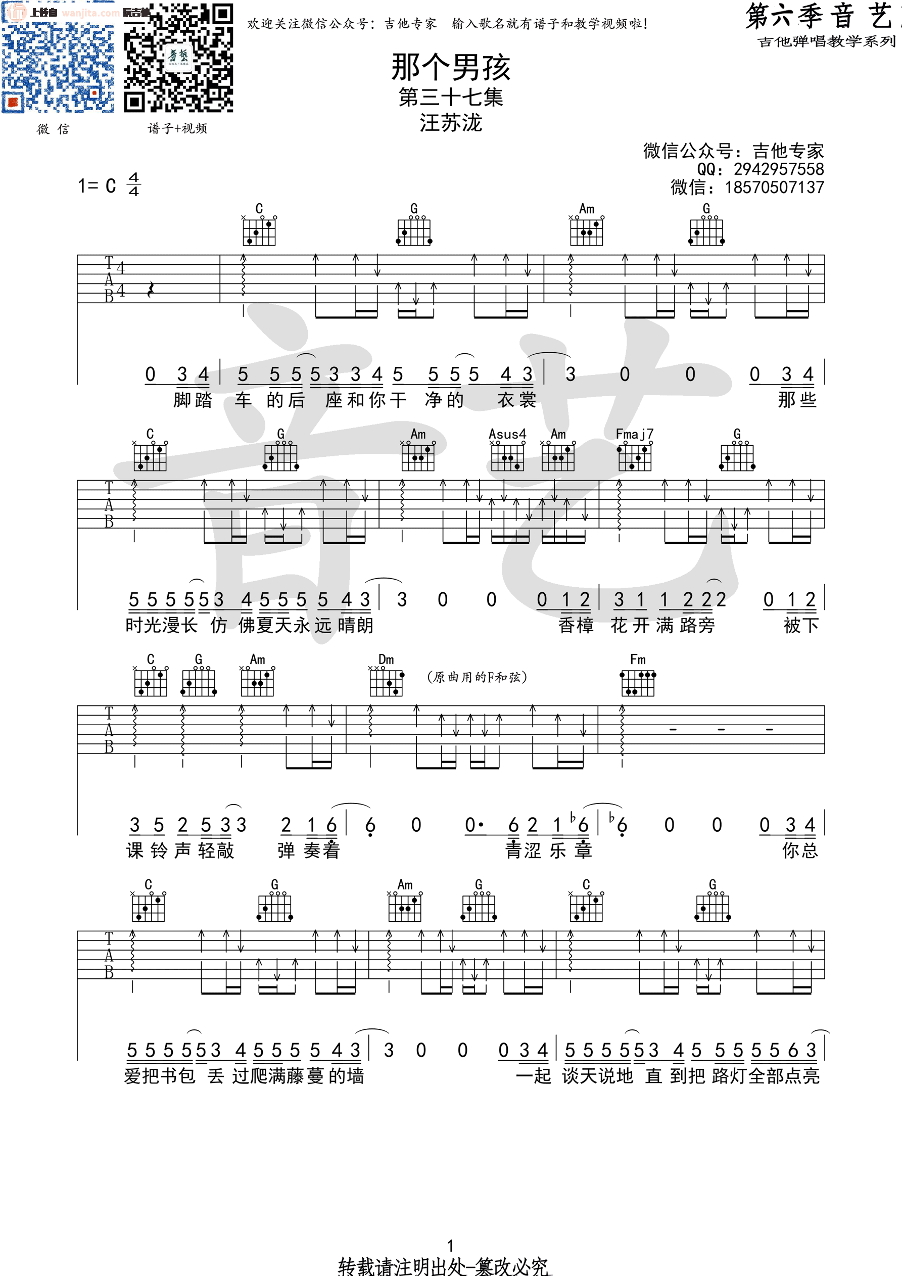 那个男孩吉他谱 - 汪苏泷 - C调吉他弹唱谱 - 原版
