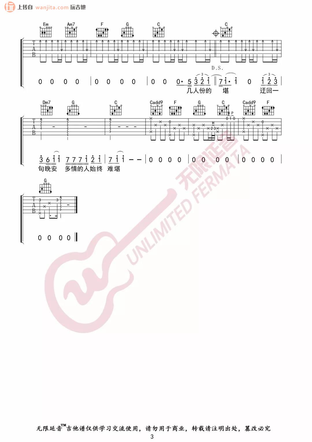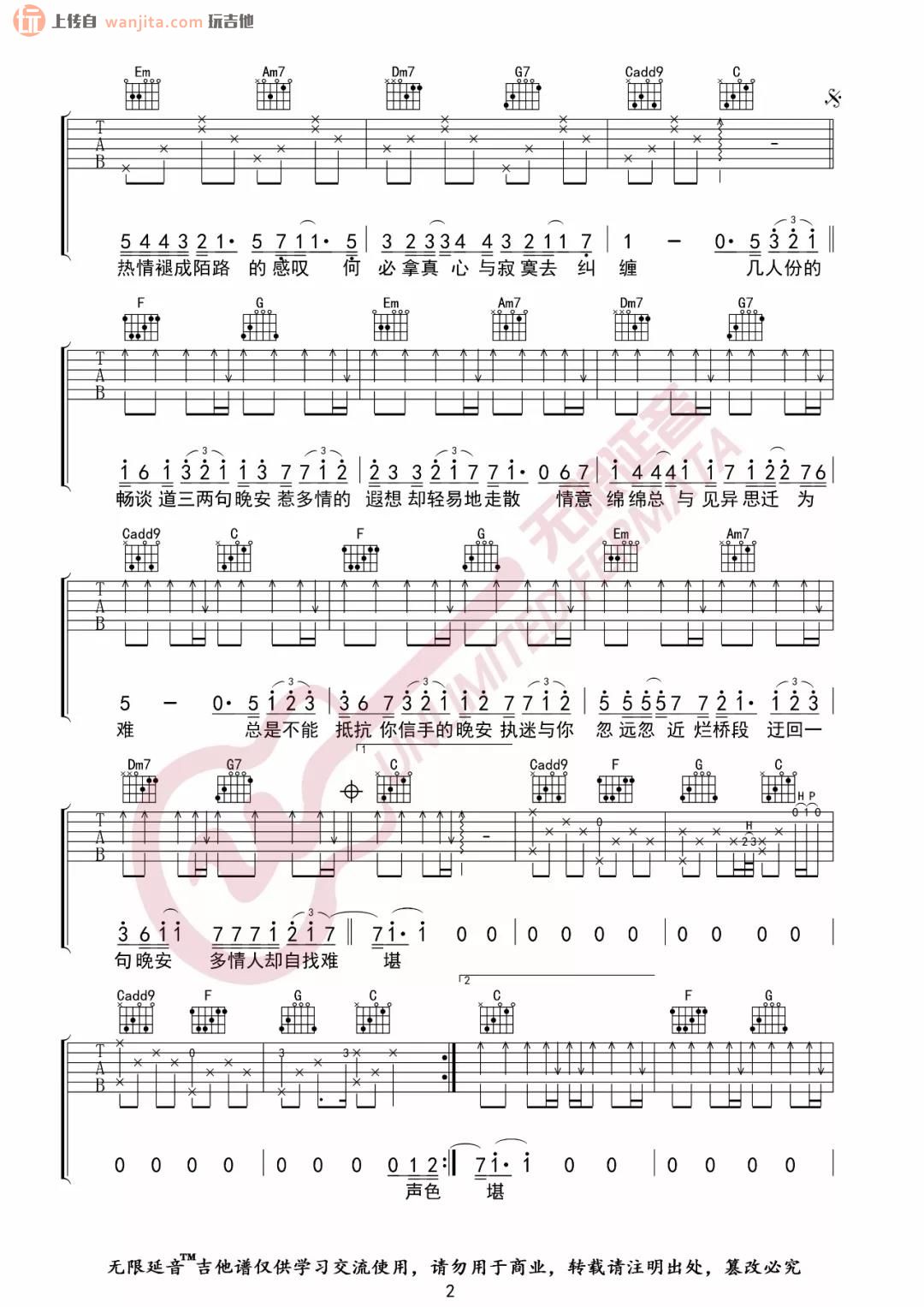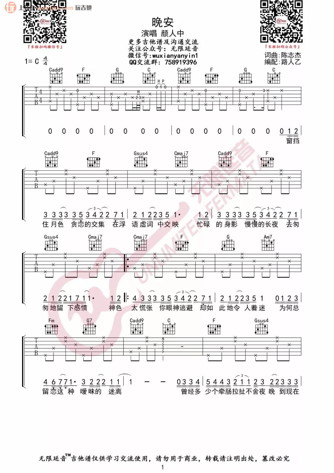 曲谱介绍: 颜人中《晚安》吉他弹唱谱,采用C调指法编配原版,共有3张高清图谱。