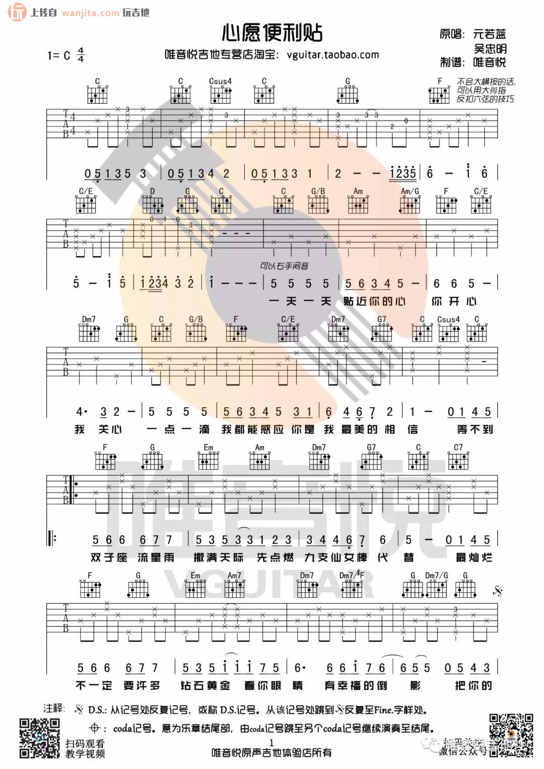 心愿便利贴吉他谱 - 元若蓝 - C调吉他弹唱谱