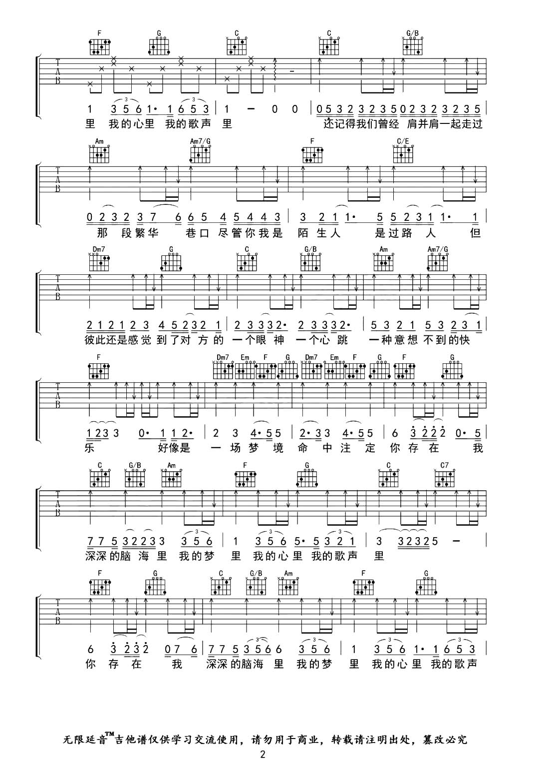曲谱介绍: 曲婉婷《我的歌声里》吉他弹唱谱,采用C调指法编配原版,共有3张高清图谱。
