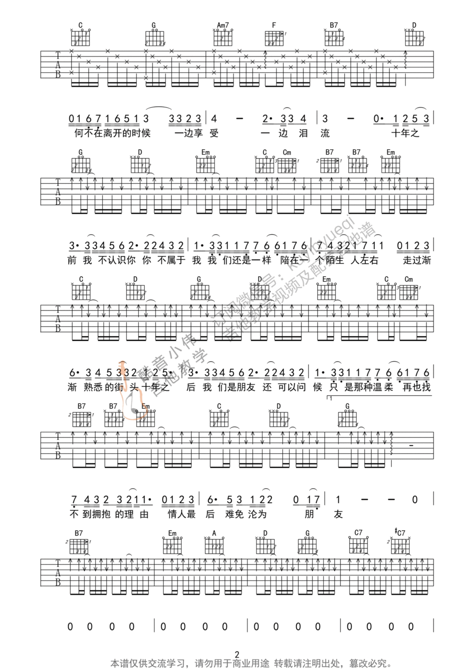 曲谱介绍: 《十年》吉他谱,是由酷音小伟分享,这个版本按照原版的编曲来打造,只是将吉他替代了钢琴的伴奏,原调是bA,选用G调指法,4/4拍,男声夹1品或不夹,女声可以考女5-7品,根据自己的音域而选择,实际原调是需要夹1品。下面包含了《十年》的吉他弹唱视频,大家可以提前先参考,不懂的部分可以参考视频配合吉他谱练习。 《十年》吉他弹唱视频教学