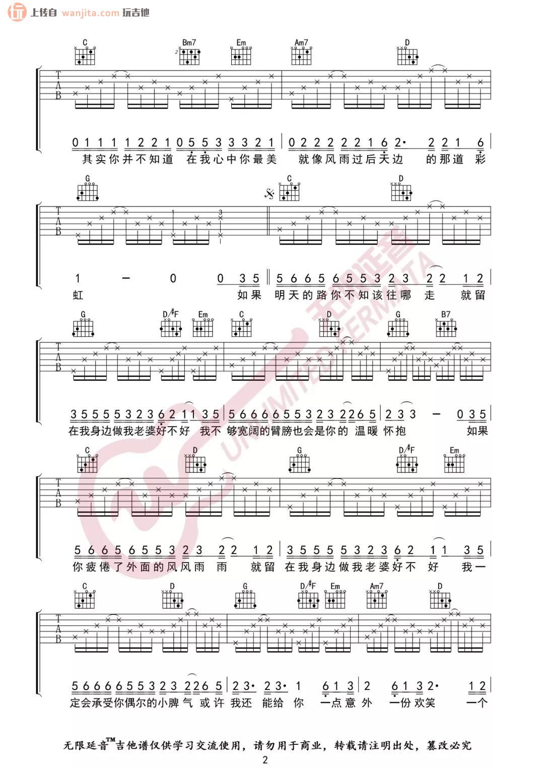 曲谱介绍: 《做我老婆好不好》吉他谱由无限延音编配分享,选用G调指法,包含前奏,可能稍微有些难度,节拍较快,而且指法变化频繁,需要大家花点心思练习,主歌部分的弹唱不算难,整首歌曲没有扫弦部分,正好适合这首温暖抒情歌曲。