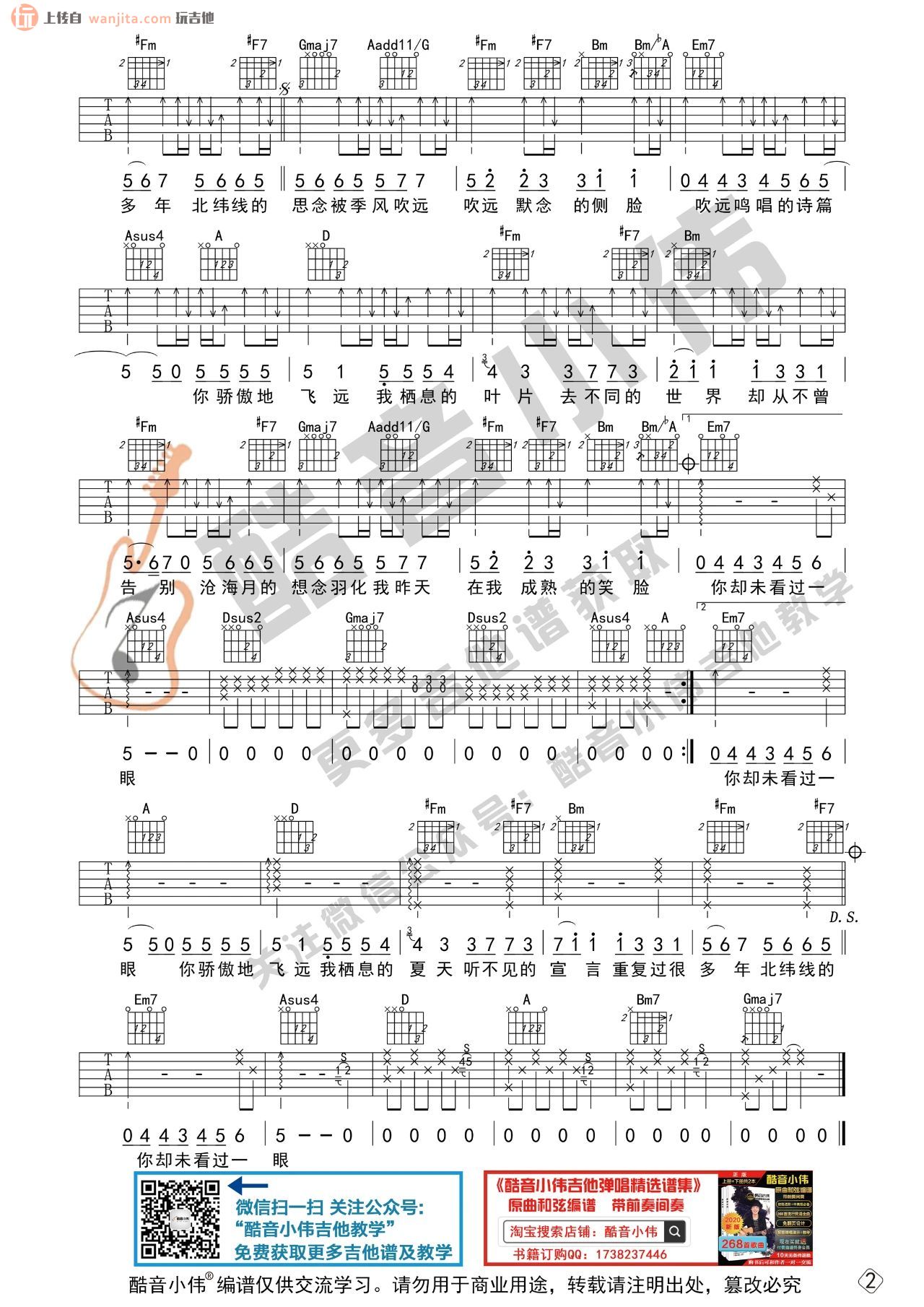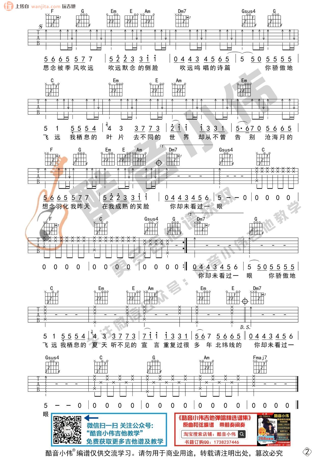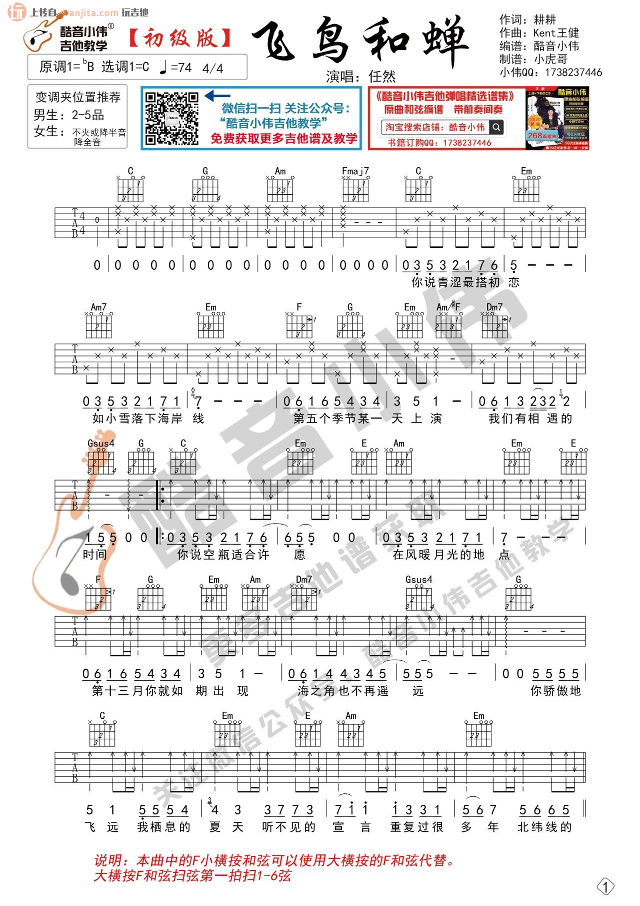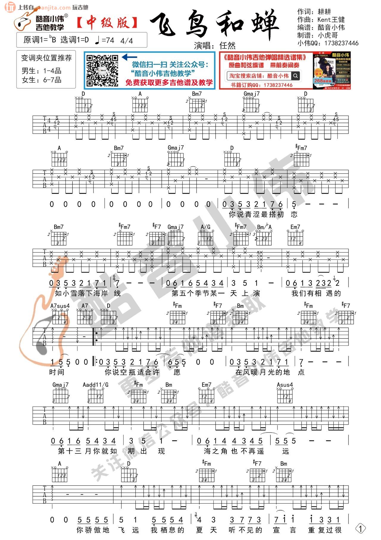 曲谱介绍: 《飞鸟和蝉》吉他谱,由酷音小伟编配分享,这个谱子输出了D调中级版和C调初级版两个版本,供大家选择,下方的视频弹唱部分是针对中级版进行的演示,歌曲基本上按原版来编配,之前玩吉他的小编老师已经更新过好几个版本,各有各的味道,喜欢的朋友也可以参考上方的这首歌的其他谱子版本进行练习。 《飞鸟和蝉》吉他弹唱视频教学