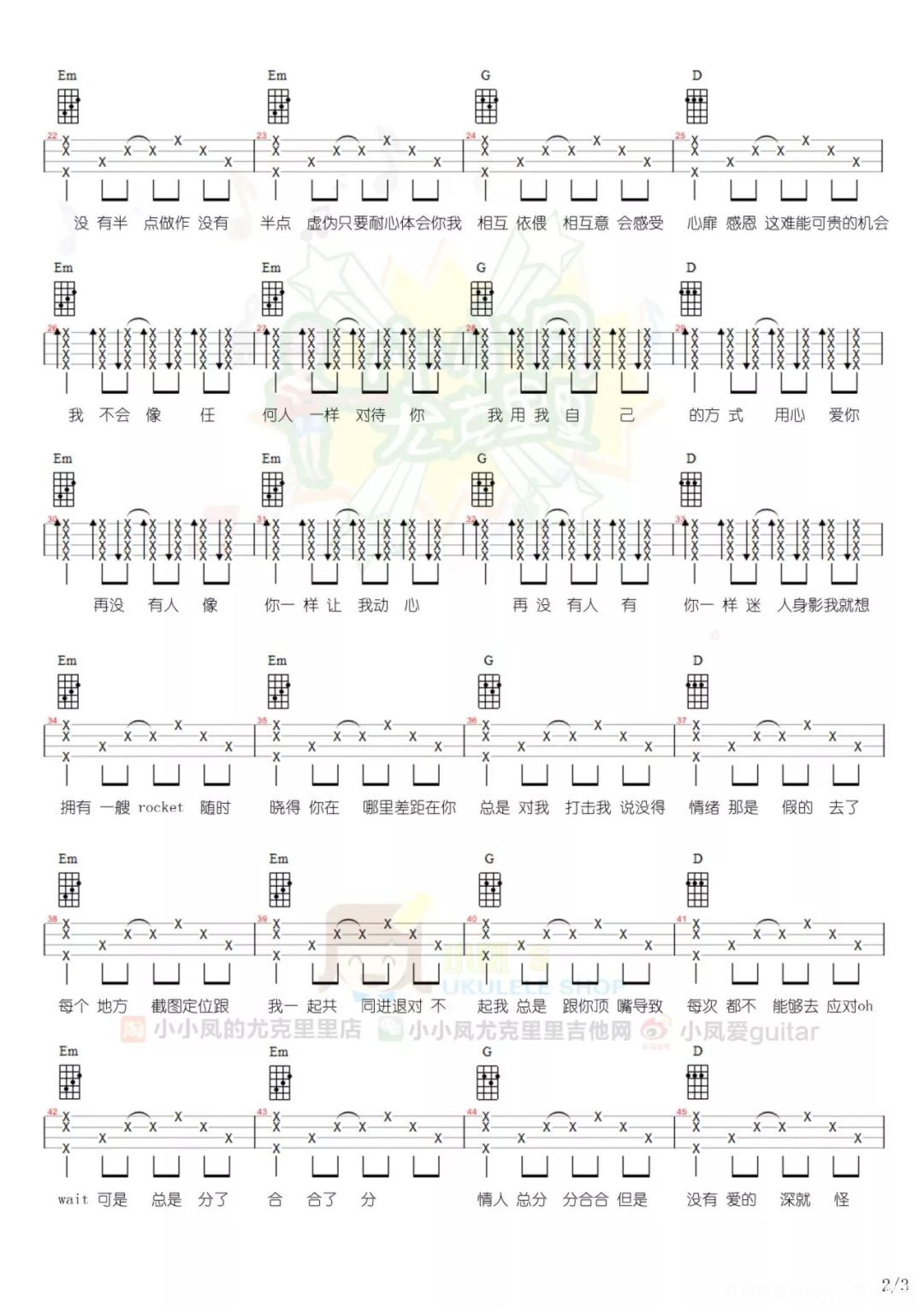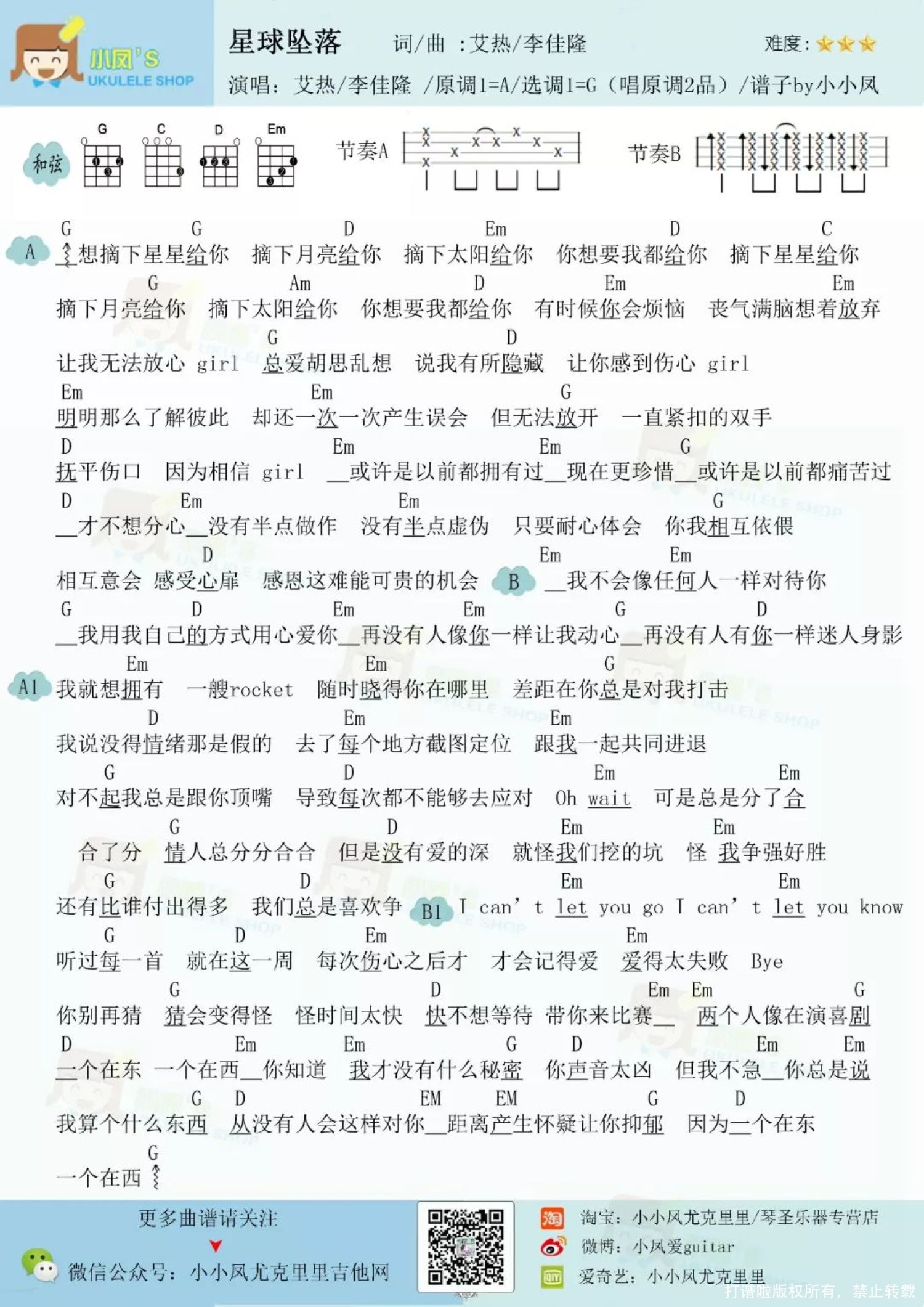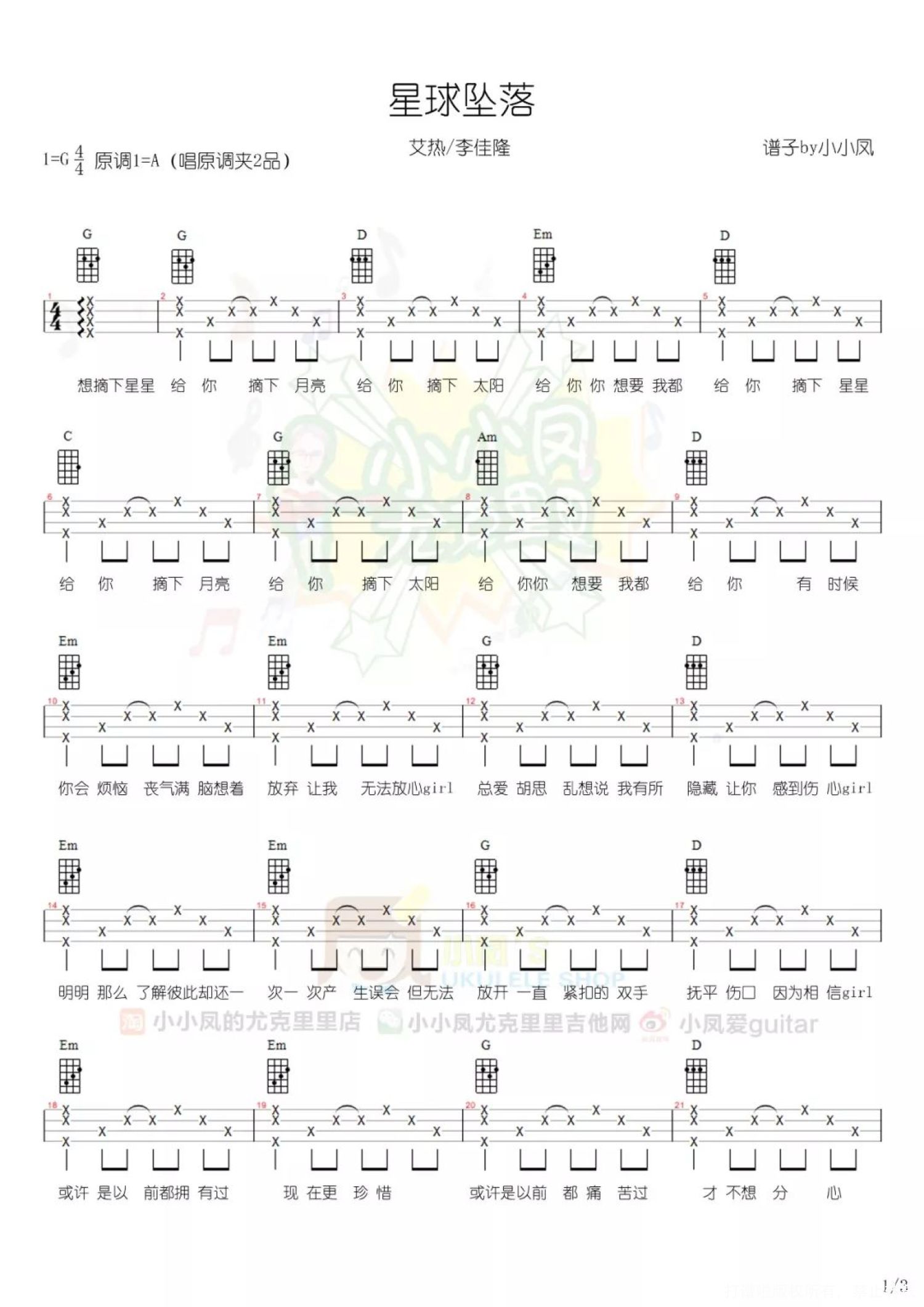 曲谱介绍: <星球坠落> 小凤版 <星球坠落>中国新说唱现场版 尤克里里谱子 目录 说实话,在还没接触<中国新说唱>之前 我一直以为hip-hop、Rap这类音乐都是有点带有攻击性的 歌手会通过这种方式来diss一些人和事 以此来表达自己的情绪 但看了最近一期的<中国新说唱>后 彻底改变了我的看法 一个说唱节目居然出现了一首“年度最佳情歌” 真是天不怕地不怕,就怕Rapper说情话 这首歌有种让你不知不觉 就循环一整天的魔力 温柔又甜蜜的词 让人产生了一种正在谈恋爱的错觉 下午在公司听了几遍 居然没忍住拿出了ukulele弹了起来   <星球坠落> 小凤版 艾热和李佳隆两人,将自己对心上人的宠爱全部都写进了歌里。歌词直白的表达了一个男孩的爱意和宠溺之情 要星星要月亮要太阳 只要你要我所有都会给你 这些情话通过Rap出来 让人心瞬间被爱融化的感觉 刚好再过几天就是七夕情人节了 我想在情人节那天 将这首歌送给自己心上人再适合不过了   <星球坠落>中国新说唱现场版   尤克里里谱子 详谱: