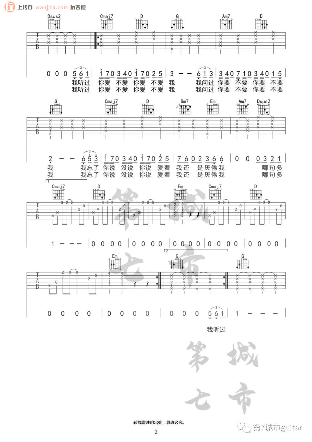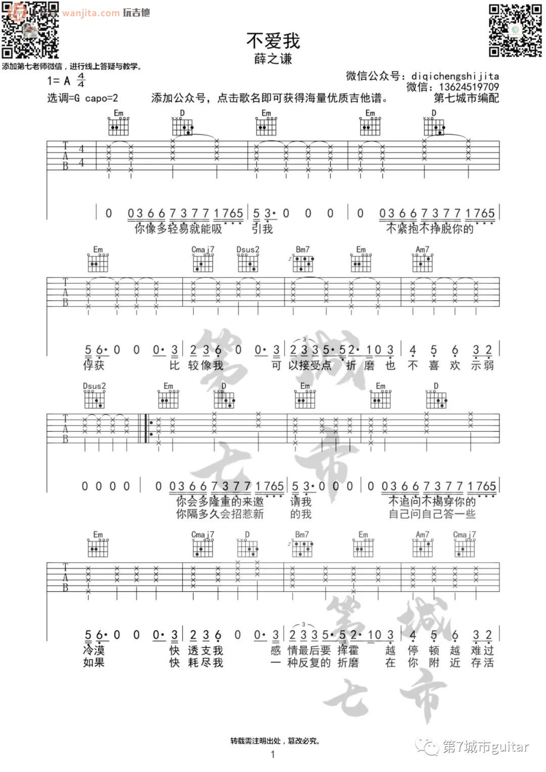 曲谱介绍: 《不爱我》吉他谱由第七城市分享,原调A调,选用G调指法,变调夹夹2品,可以弹唱原调,曲谱不会很复杂,主副歌部分的指法也非常的简单,新手也可以很好的练习这首歌曲。