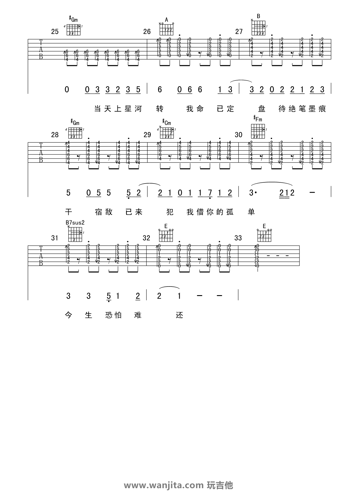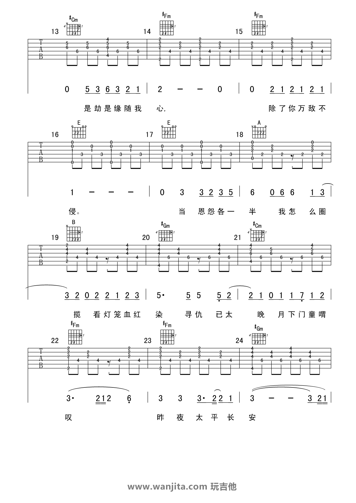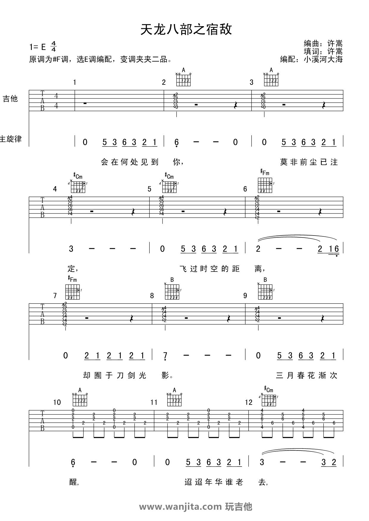 曲谱介绍: 《宿敌》原调为#F调,选用E调指法编配,变调夹夹 2品处弹唱原调。和弦指法上可能对于新手稍微有一点点难度,涉及到一部分的大跨度,而弹唱的节奏还好,所以需要有一定大横按的基础。