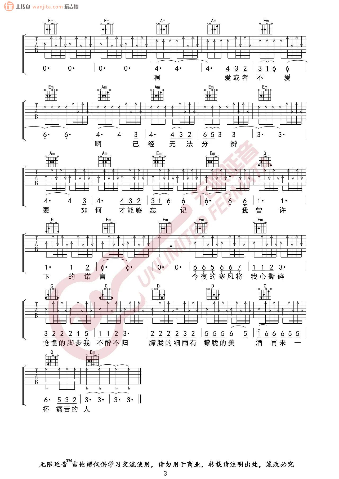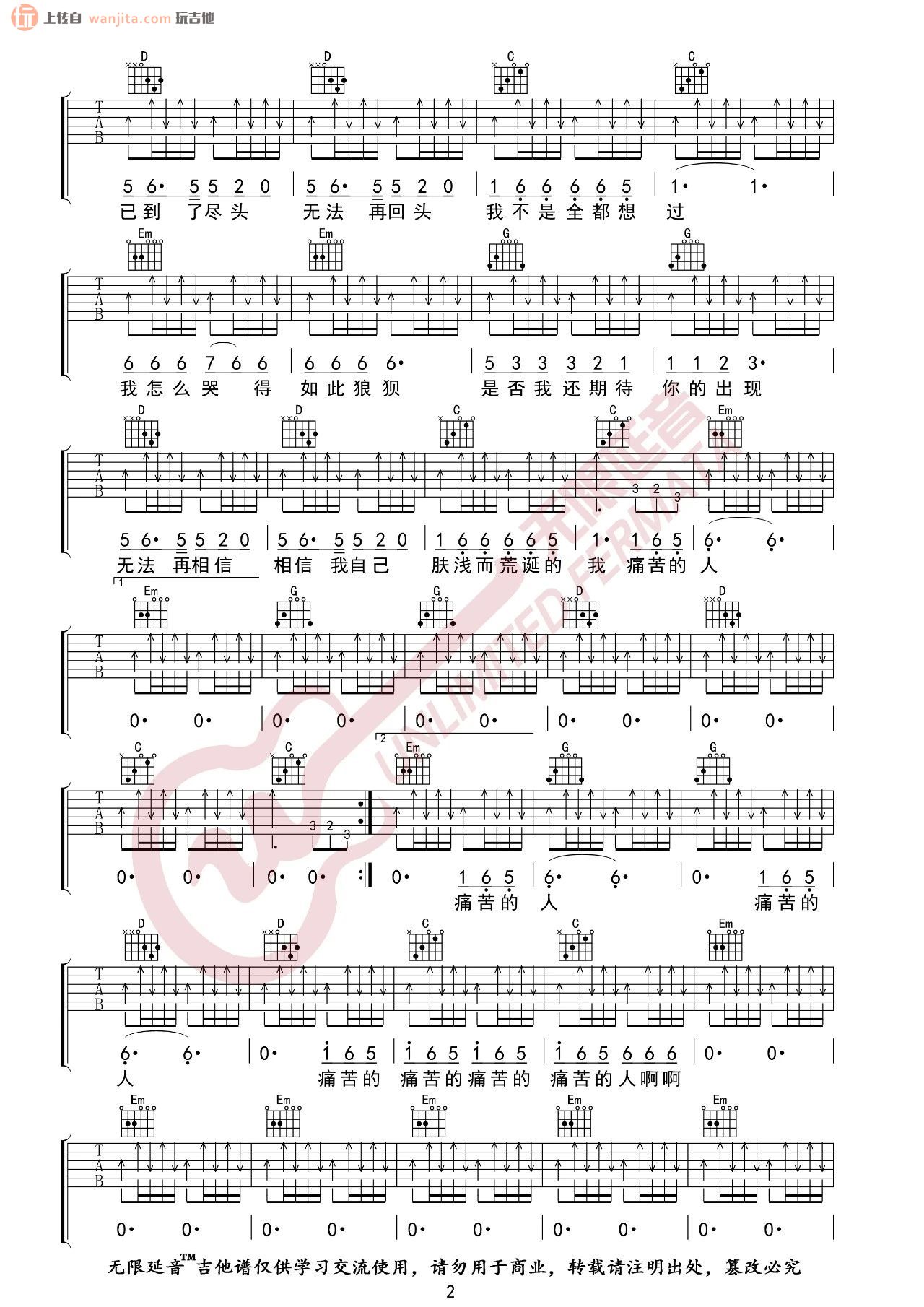 曲谱介绍: 《痛哭的人》吉他谱,由无限延音分享,选用G调指法编配,全程高速扫弦节奏弹唱,和弦指法部分难度不大,扫弦的时候,需要把握好节拍以及层次感的清晰,否则这首歌曲会弹唱较乱。所以建议大家花时间集中精力的练习好右手即可。