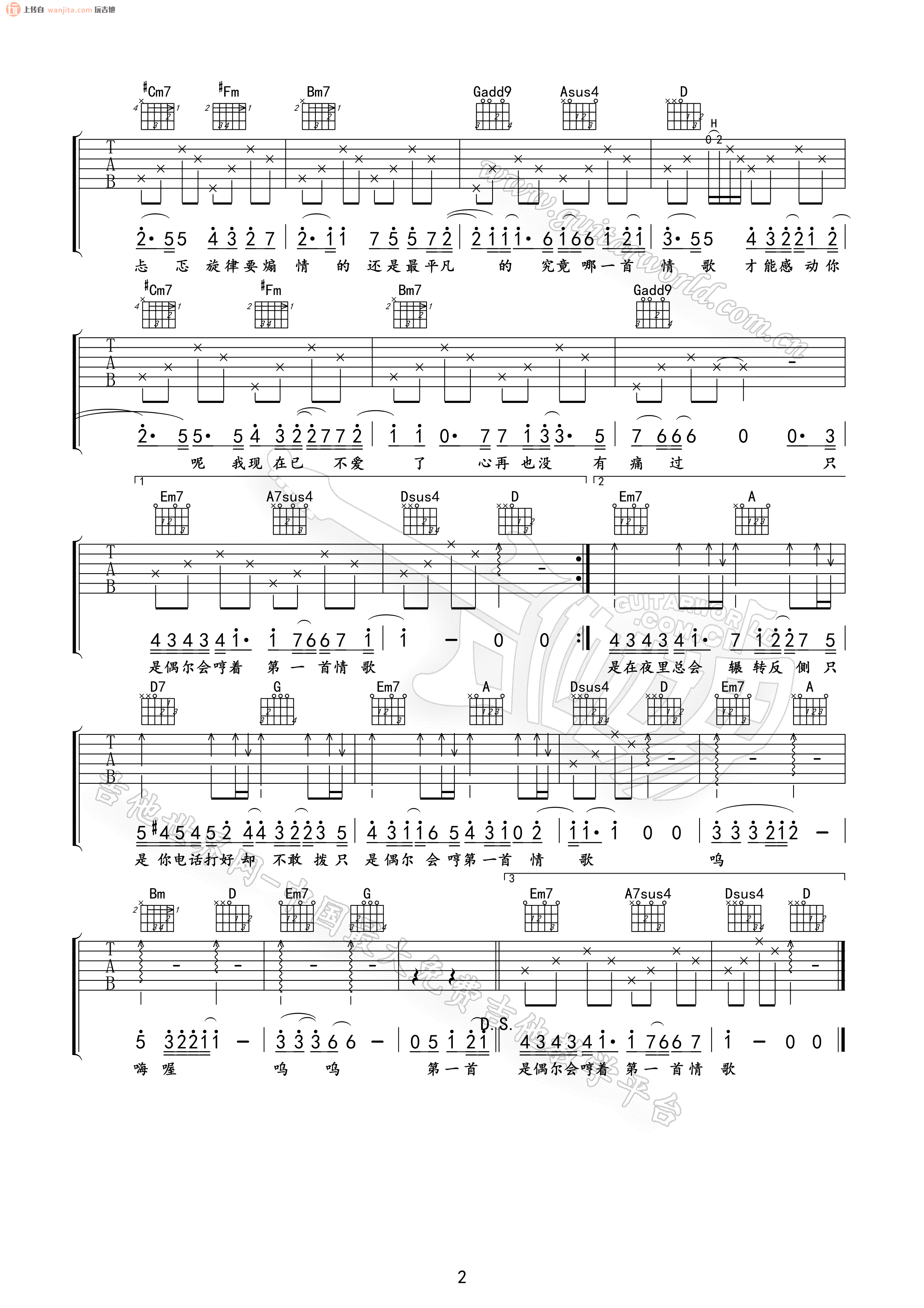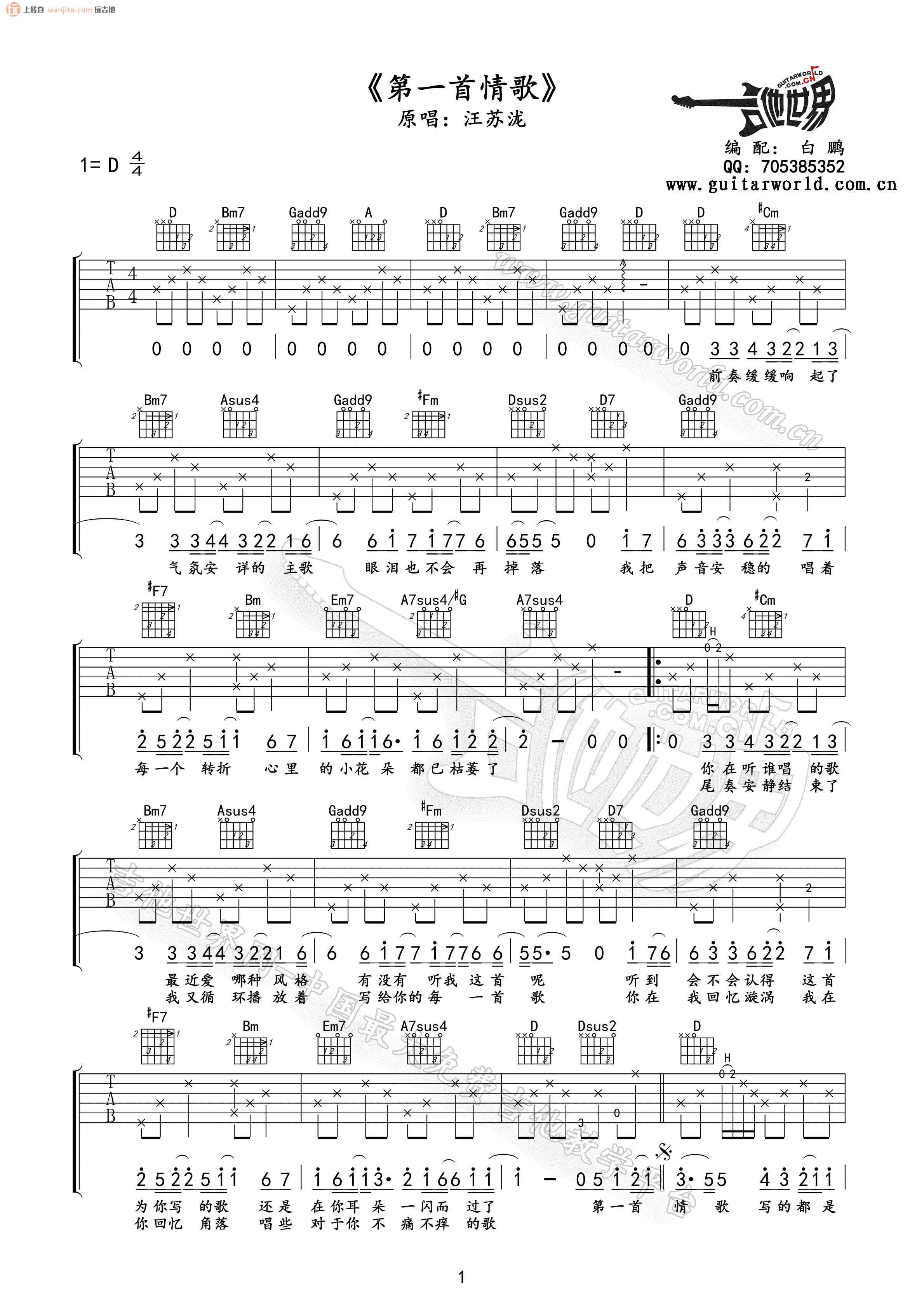 第一首情歌吉他谱 - 汪苏泷 - D调吉他弹唱谱 - 原版