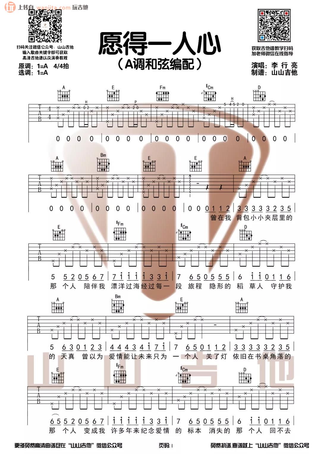 愿得一人心吉他谱 - 李行亮 - A调吉他弹唱谱 - 原版