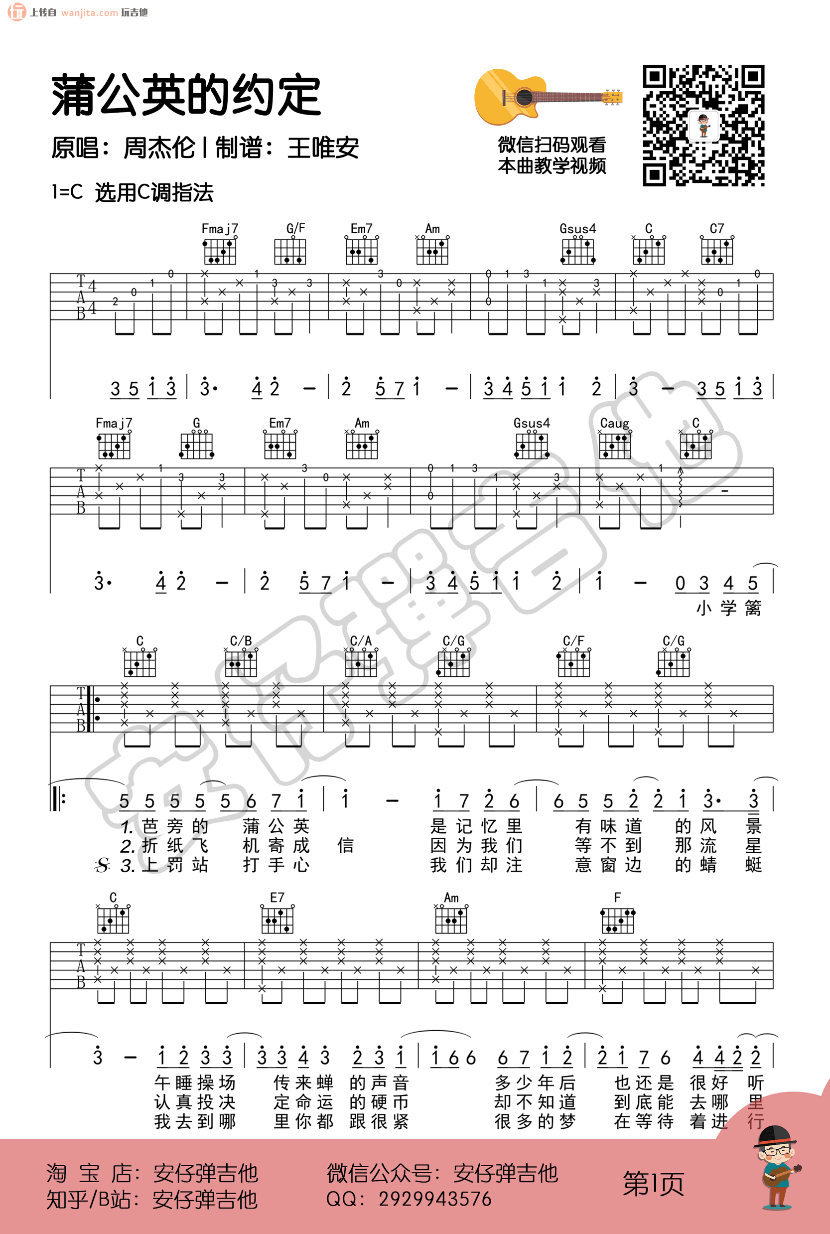 曲谱介绍: 《蒲公英的约定》吉他谱,由安仔编配分享,原调C调,选用C调执法弹奏。这个谱子和原版的编曲几乎接近,可能在音符的复杂程度稍微有一丝缩减,包括了标准的前奏和间奏,可以作为一个简单原版来练习 《蒲公英的约定》吉他弹唱视频教学