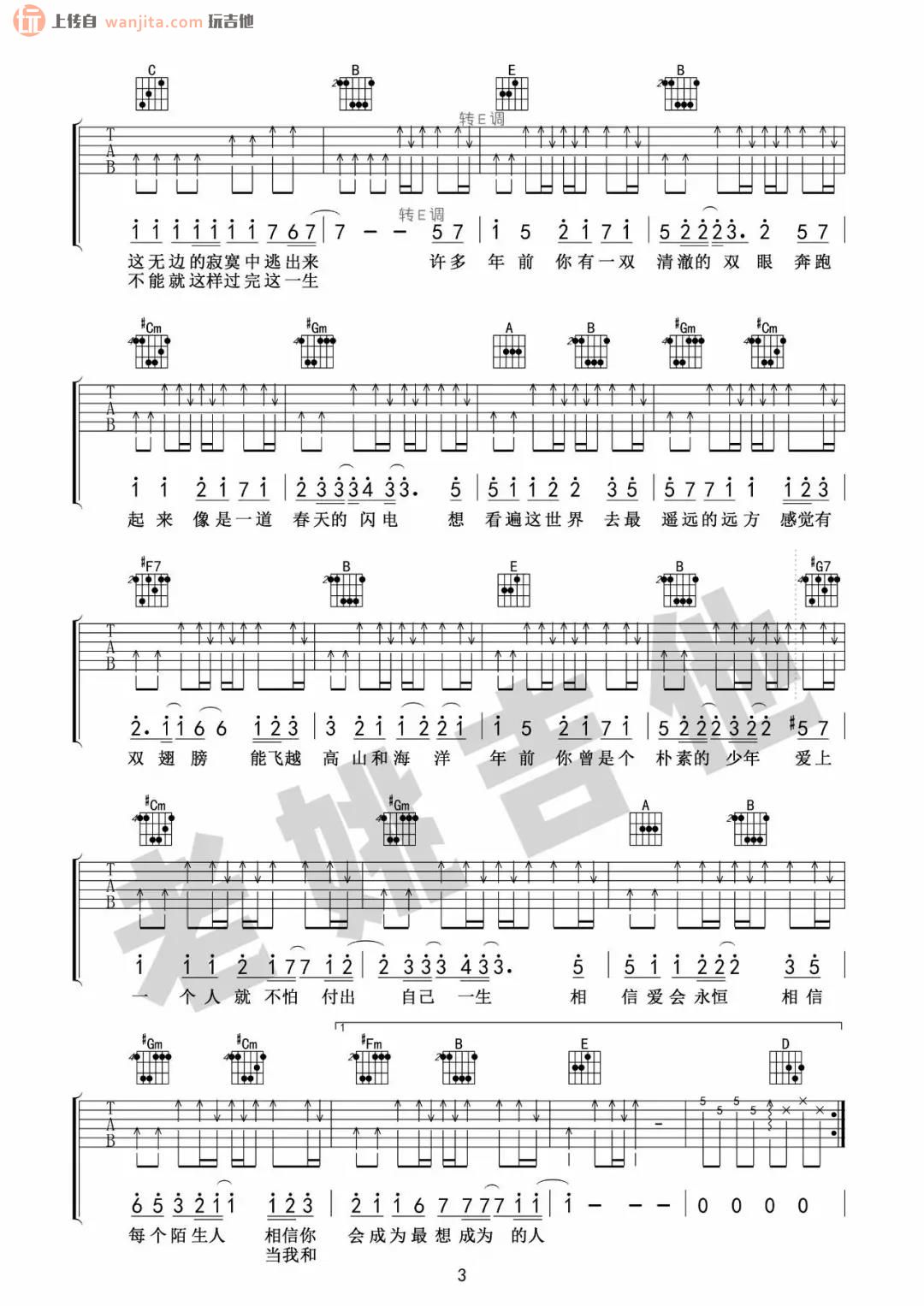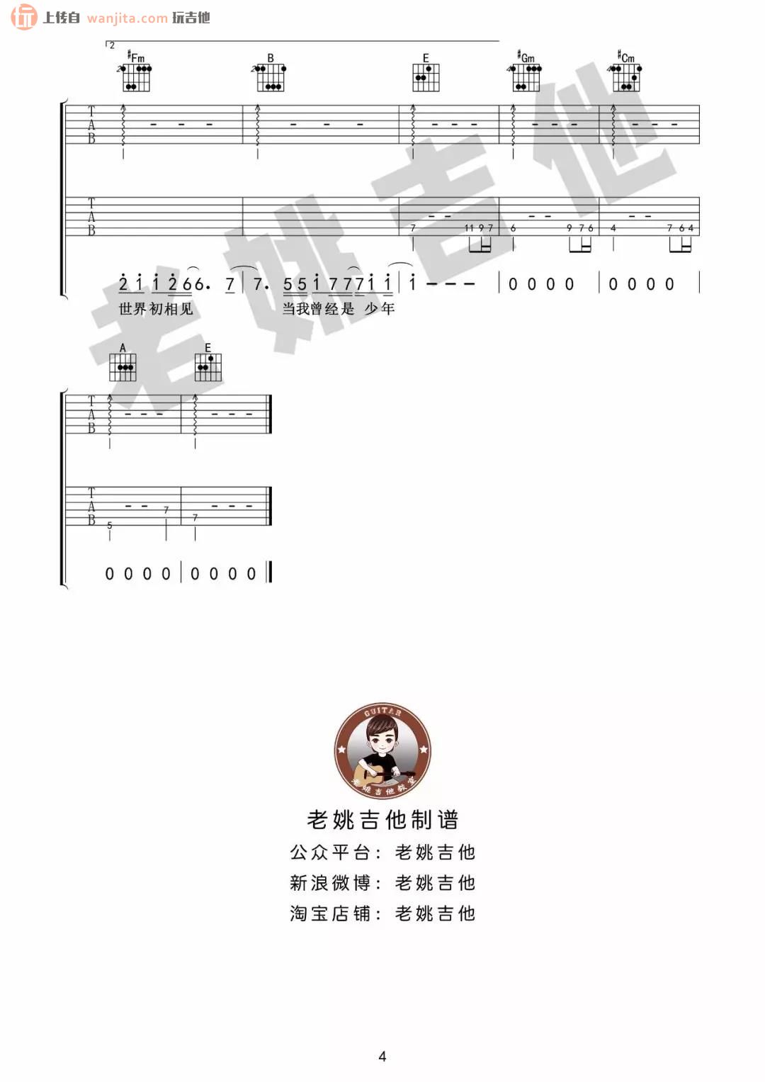 曲谱介绍: 《你曾是少年》吉他谱,G调转E调,由老姚吉他编配分享,总共4张高清吉他谱,比较完整详细,全程主要以扫弦的节奏弹唱,坚实的弹奏方式正好迎合这首充满正能量的歌曲。大家感兴趣的话可以优先参考下方老姚的吉他教学视频,跟着视频学习弹唱可能会更有助于上手。 《你曾是少年》吉他弹唱视频教学