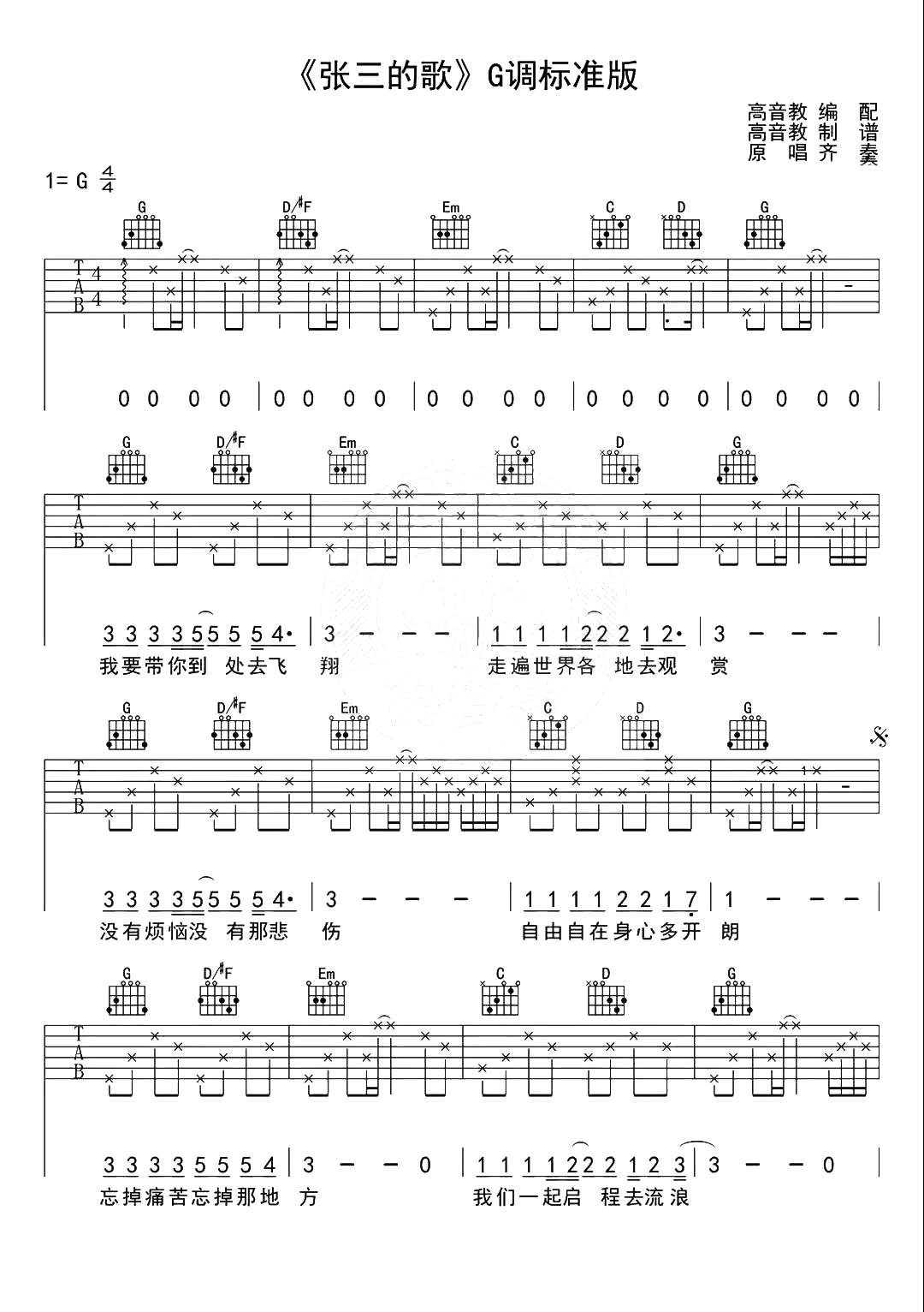 曲谱介绍: 齐秦《张三的歌》吉他弹唱谱,采用G调指法编配,共有2张高清图谱,免翻页排版设计。