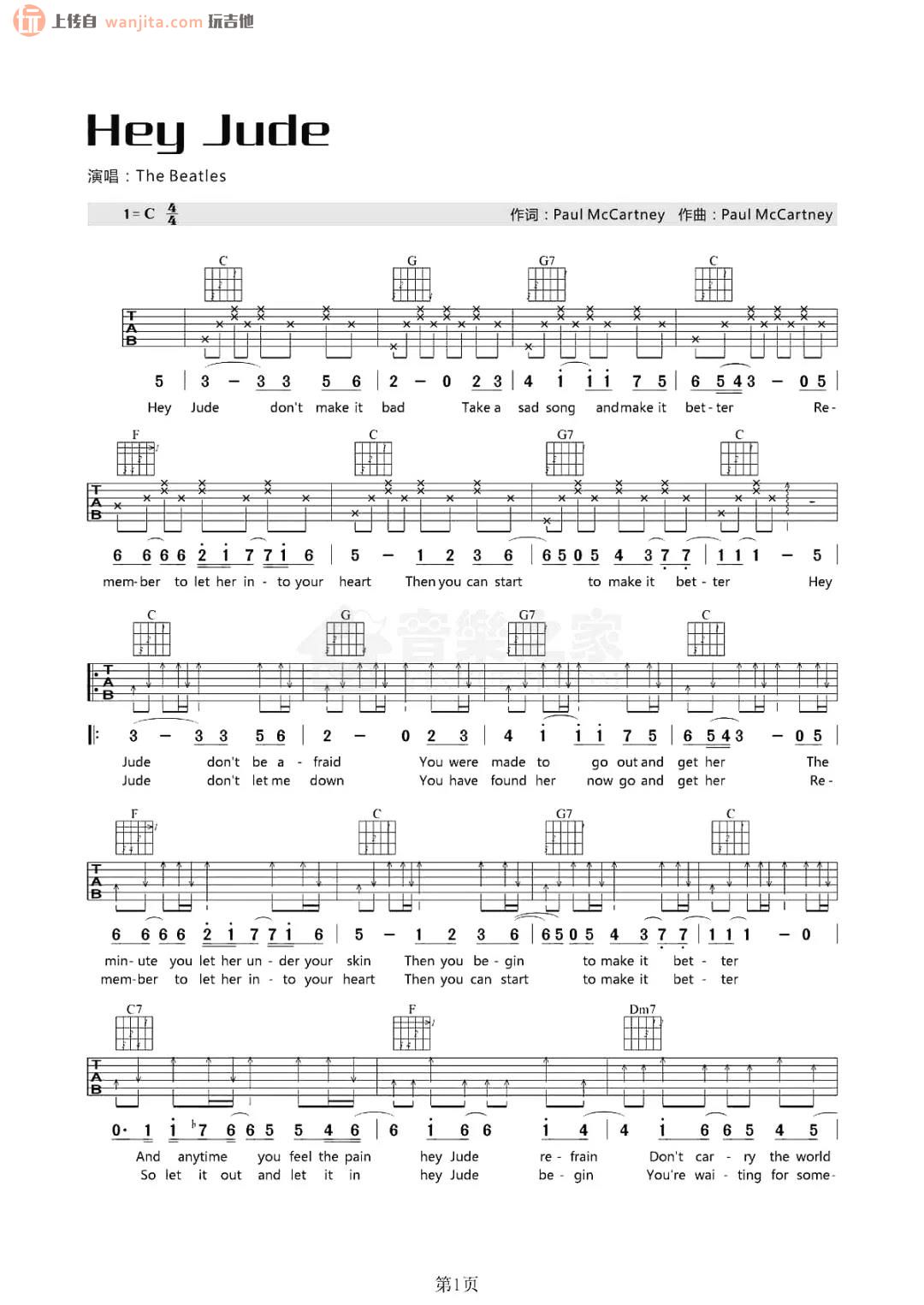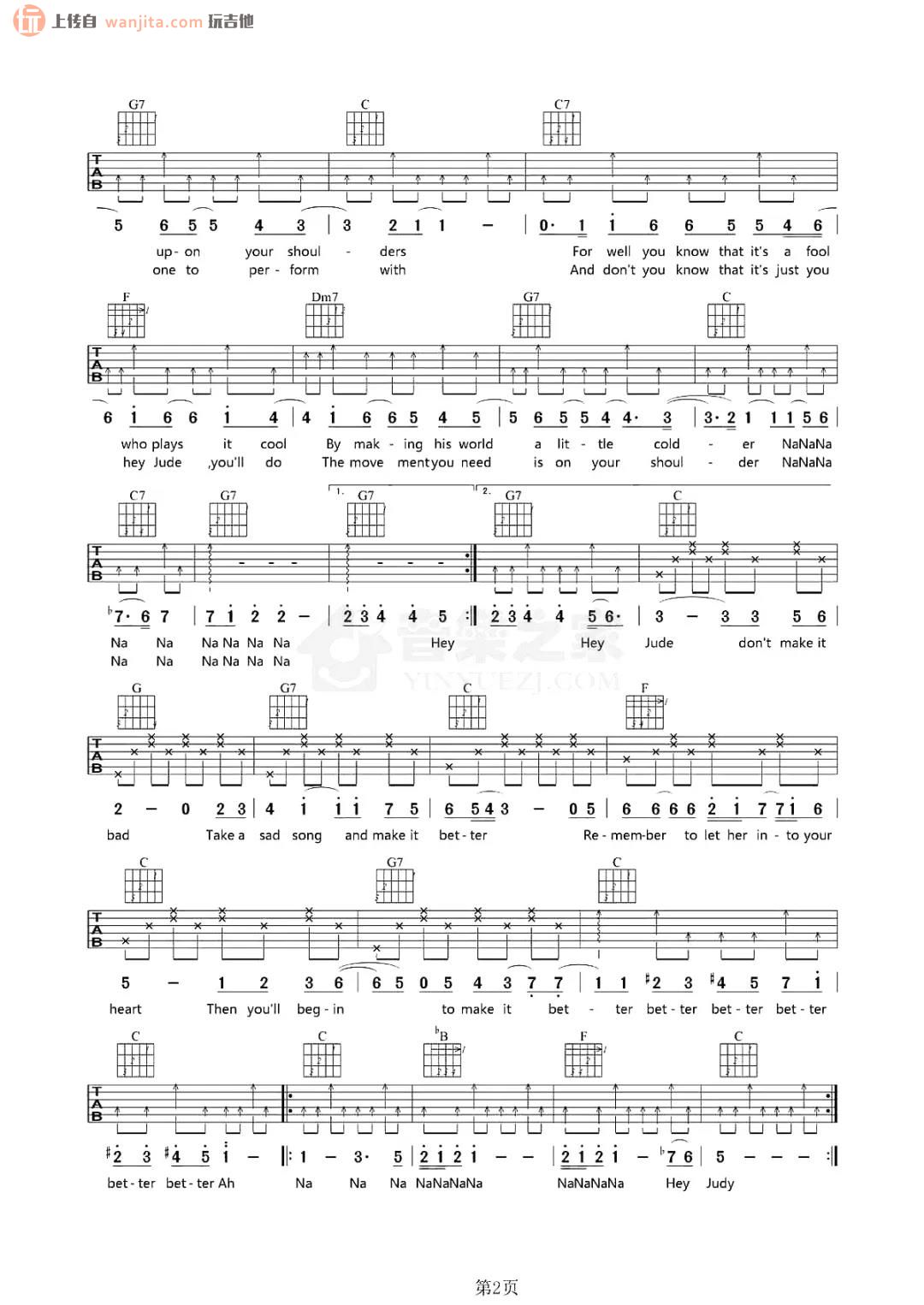 hey jude吉他谱 - 经典英文歌曲 - C调吉他弹唱谱 - 原版