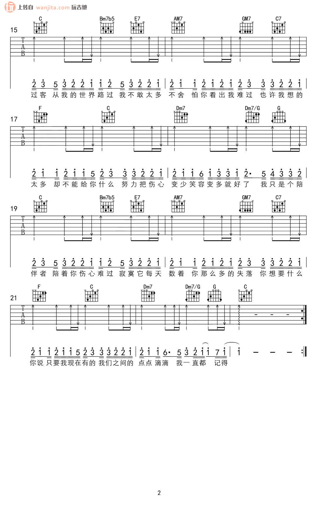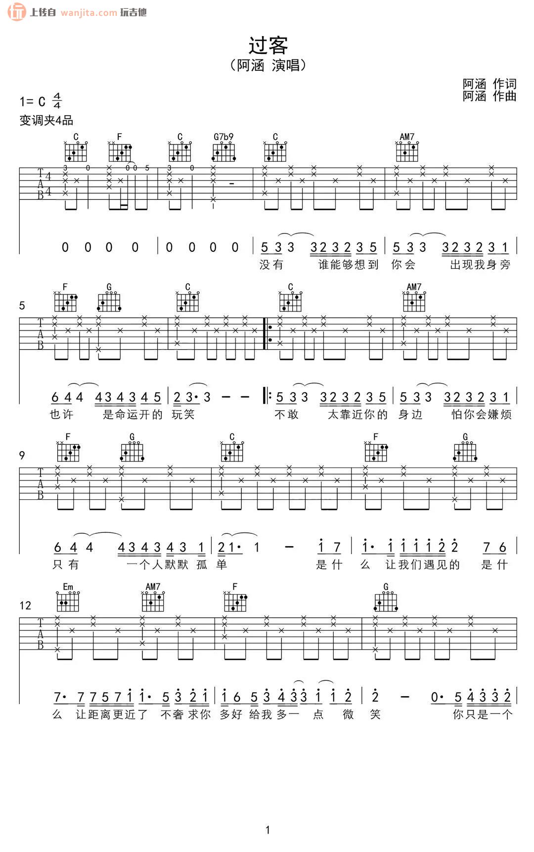 曲谱介绍: 《过客》吉他谱,原调是E调,谱子选用了C调指法,夹变调夹4品即可弹唱原调哦,歌曲简单的前奏,标准的半分解和弦配合扫弦完成这首歌的主副歌部分,难度不算大,喜欢的朋友可以赶紧试试。