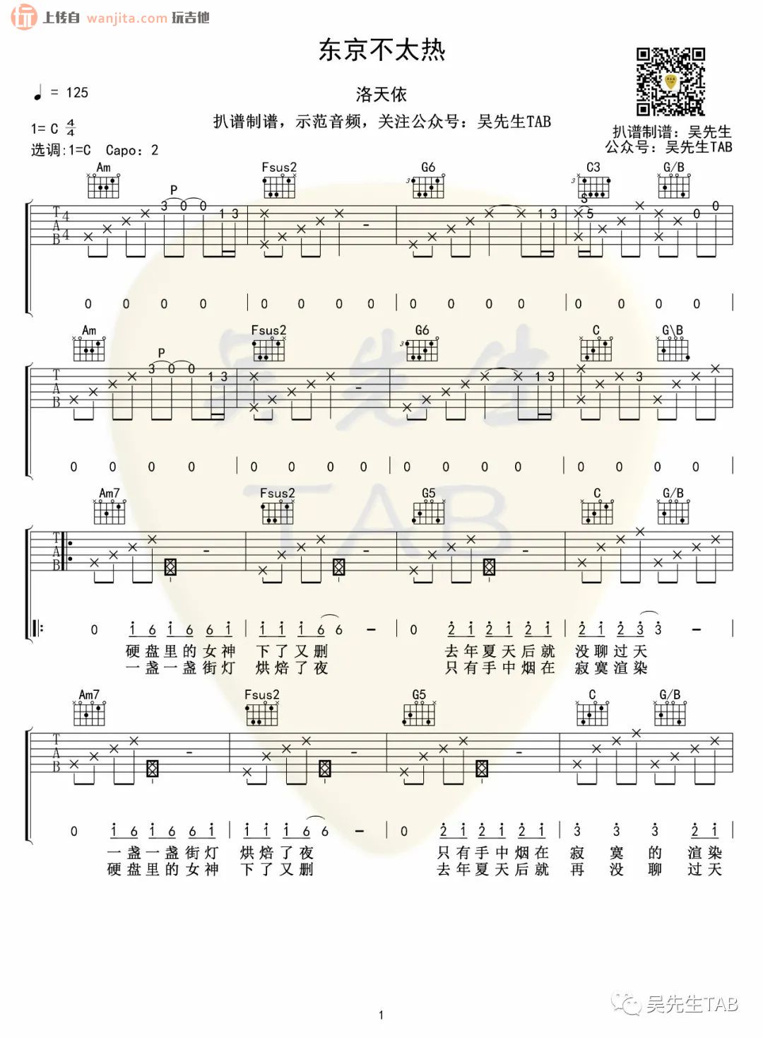 曲谱介绍: 《东京不太热》吉他谱,由吴先生提供分享,原调是C调,选用C调指法编配,变调夹夹在2品,谱子总共有4张高清图片谱,大家弹奏的时候需要注意中间有一部分是击弦的节奏,喜欢的朋友练习起来吧。