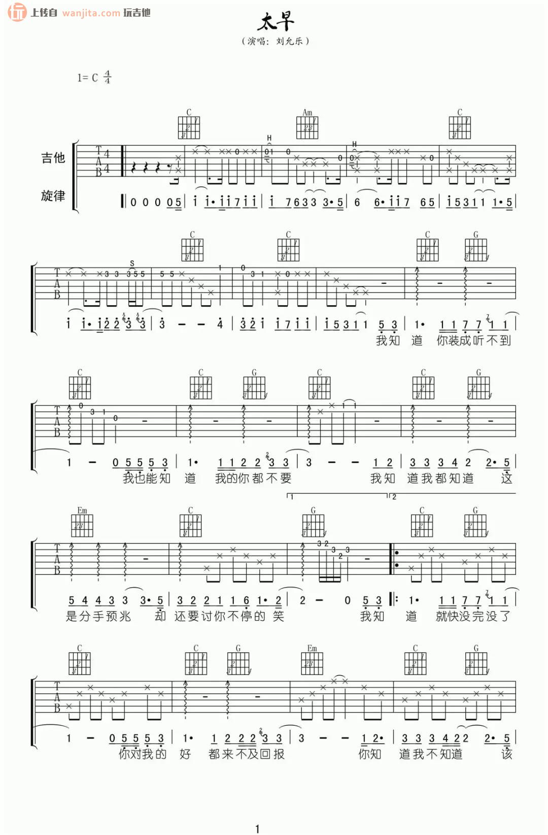 太早吉他谱 - 刘允乐 - C调吉他弹唱谱 - 原版