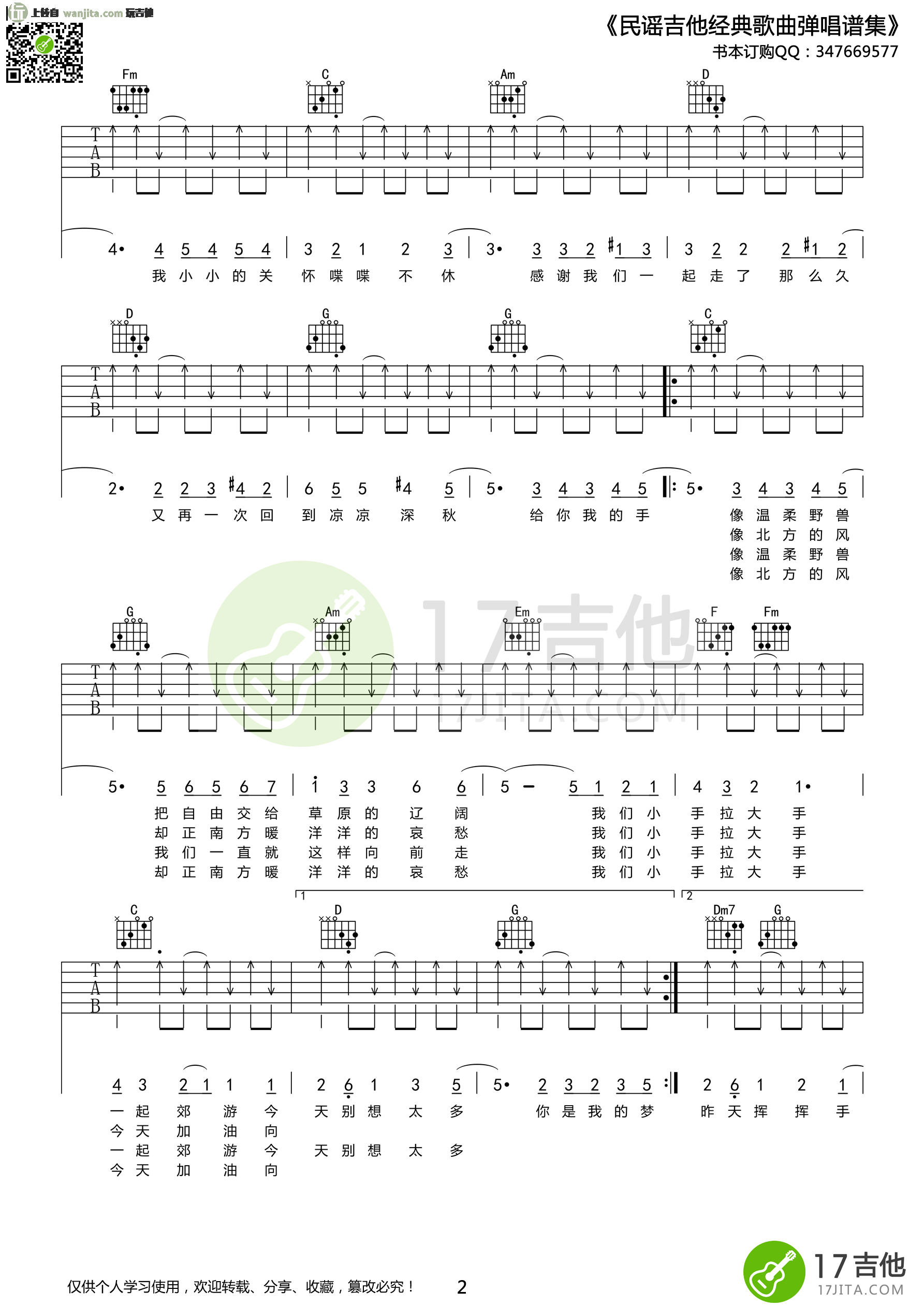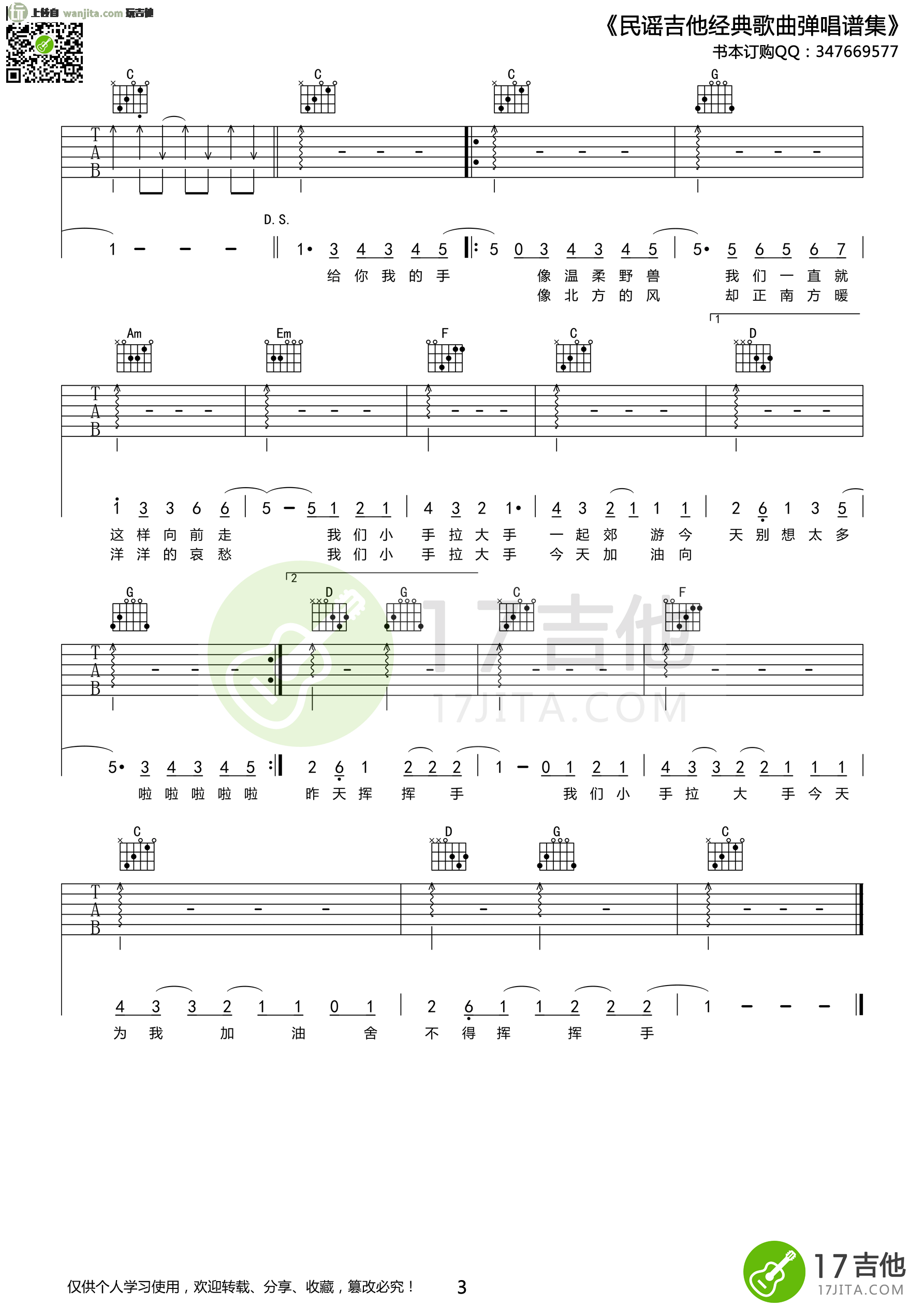 曲谱介绍: 《小手拉大手》吉他谱,由17吉他提供分享,原调是C调,4/4拍,选用C调编配,大家可以根据自己的音域选择变调夹的位置,歌曲右手弹唱节奏部分全程用扫弦贯穿,节奏上扫弦部分中的原点需要有切音技巧加入,如果缺失的话,会让整首歌曲少一些色彩,所以新手朋友可以先掌握好切音的技巧,再来练习弹唱哦。