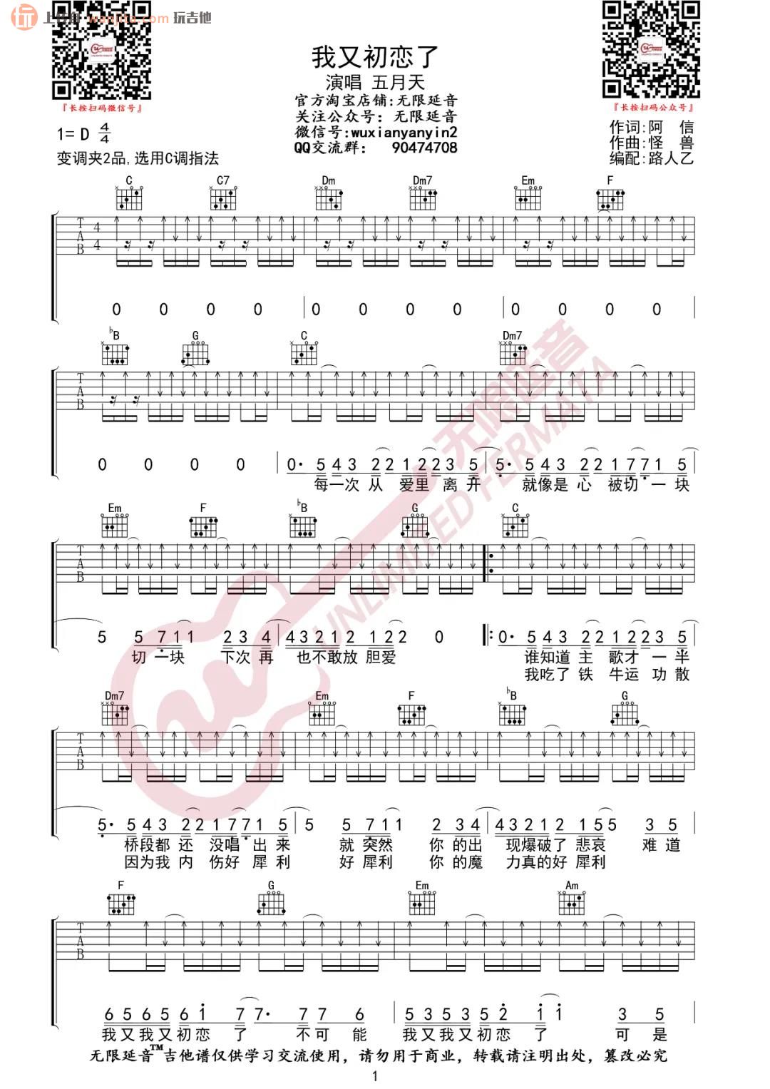 曲谱介绍: 《我又初恋了》吉他谱,由无限延音分享,原调是D调,C调指法需要夹在变调夹2品处可以弹唱原调,谱子全部为扫弦,频次较快,小伙伴们需要掌握好节拍才能将这首歌更好的表现。