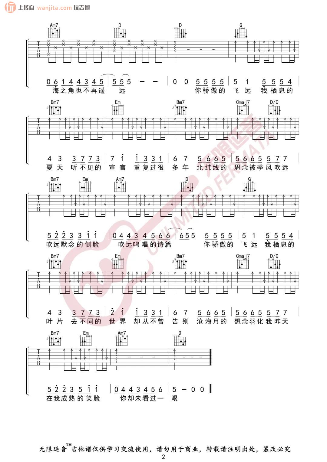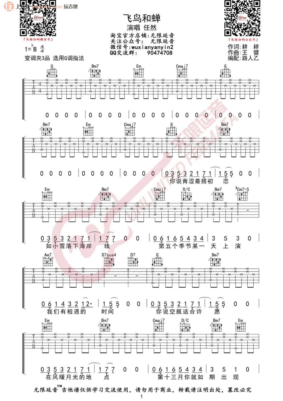 曲谱介绍: 《飞鸟和蝉》吉他谱,由无限延音分享编配,玩吉他整理上传,原调是bB调,这首谱子选用了G调指法编配,变调夹夹3品处弹唱原调,曲谱半分解和弦弹唱主歌,而前奏也是属于基本的简单版,副歌还是用扫弦来弹奏,难度不大,新手应该也能够迅速上手。
