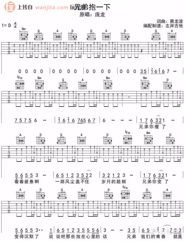 兄弟抱一下吉他谱 - 庞龙 - D调吉他弹唱谱
