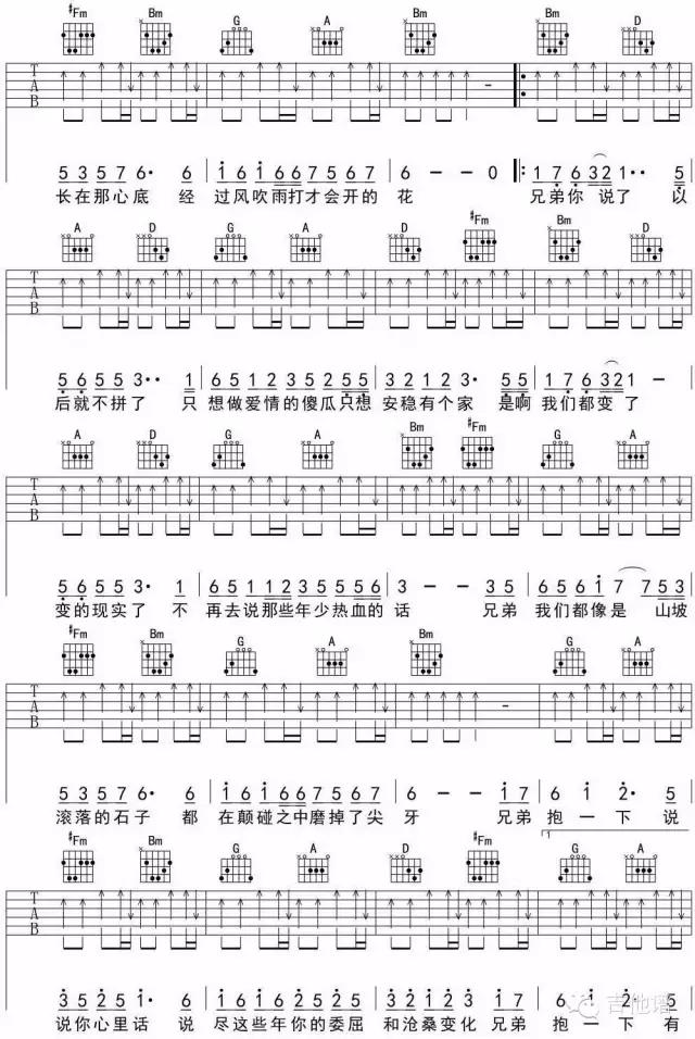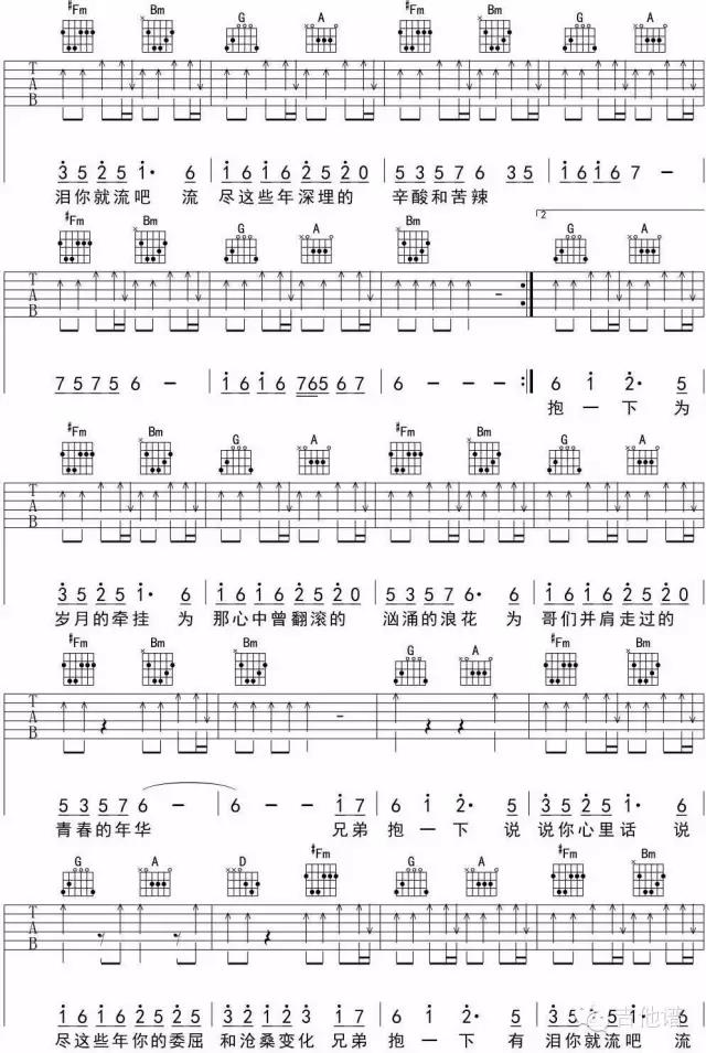 曲谱介绍: 《兄弟抱一下》吉他谱,由左岸吉他提供分享,总共4张高清图片谱,扫弦是这首歌必备的节奏。所以弹奏时一定要注意高低弦的节奏层次感,会让这首歌曲更加有味道。