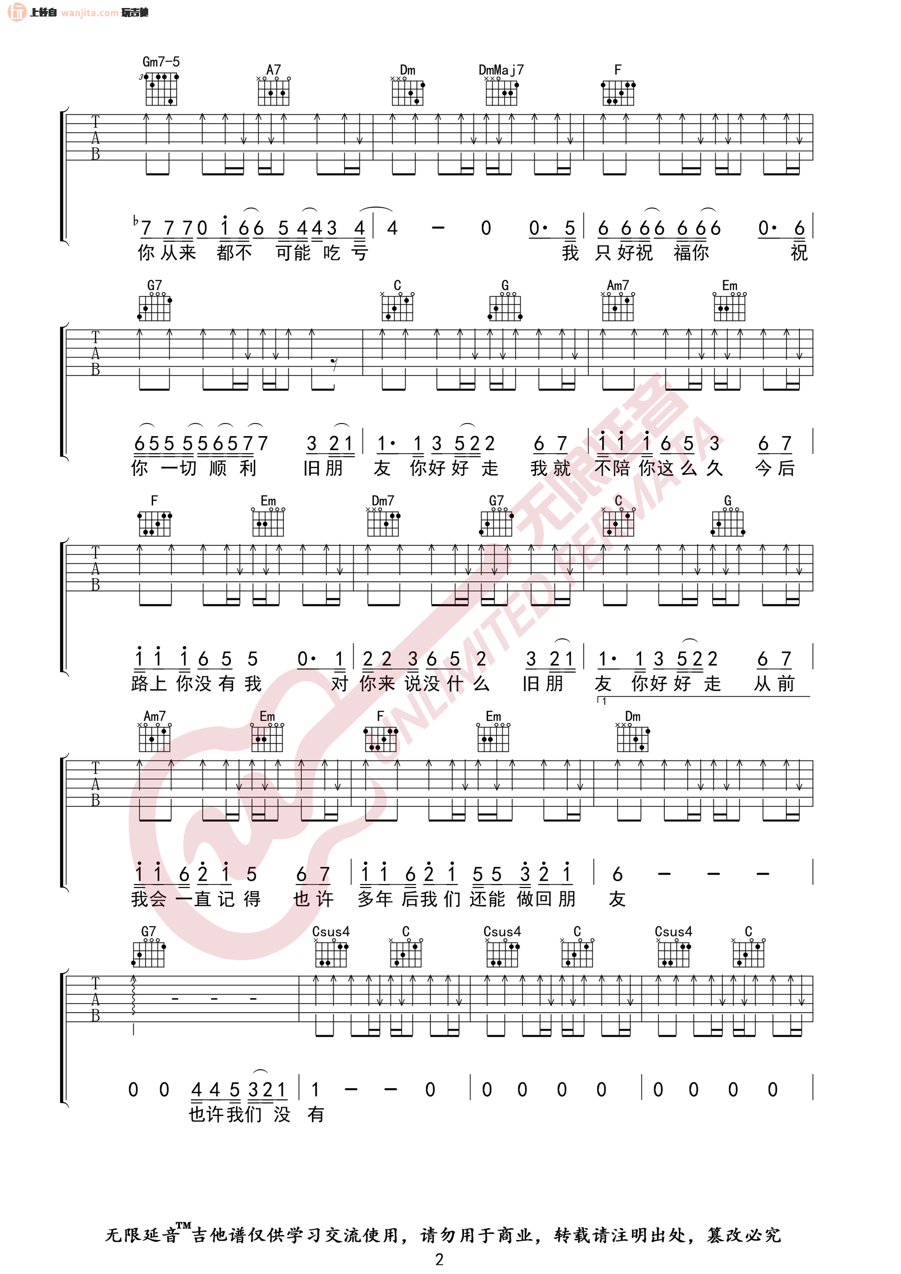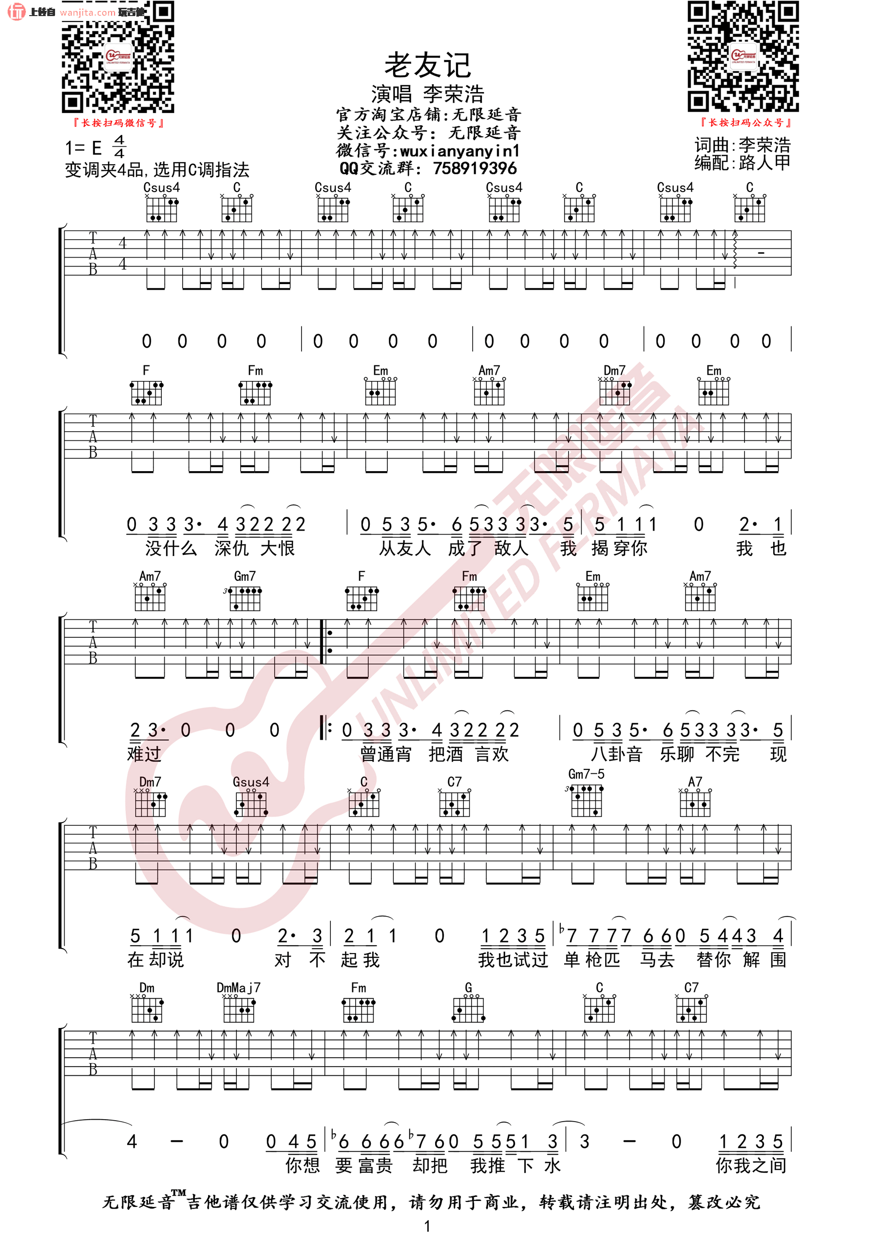 曲谱介绍: 《老友记》吉他谱,由无限延音编配分享,原调是E调,选用了C调指法,弹唱原调变调夹可以夹4品处,当然大家也可以根据自己的音域,调整变调夹,全程以扫弦节奏为主。