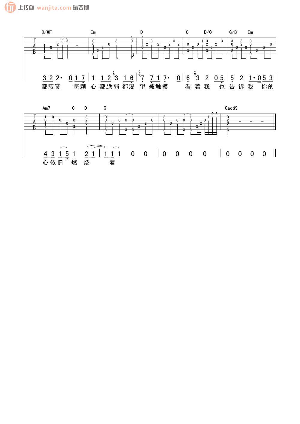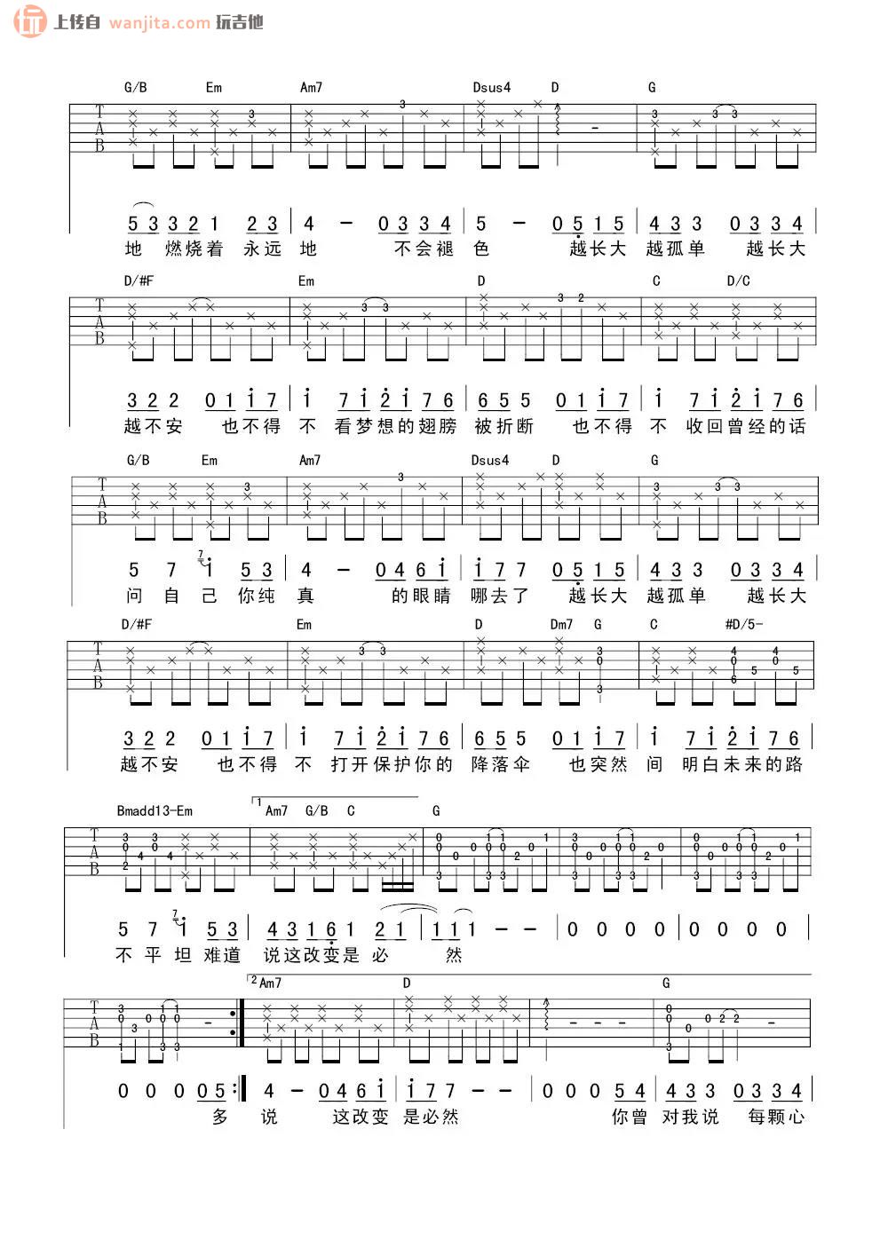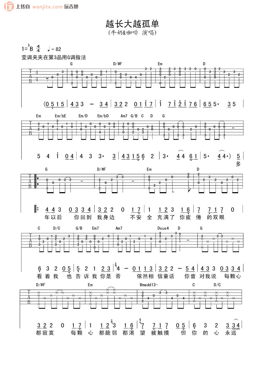 曲谱介绍: 《越长大越孤单》原调是bB调,选用了G调指法弹唱,包含了前奏,变调夹夹3品可以弹唱原调。