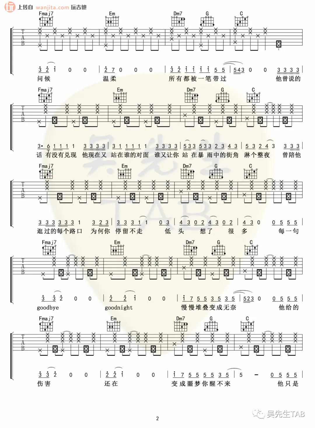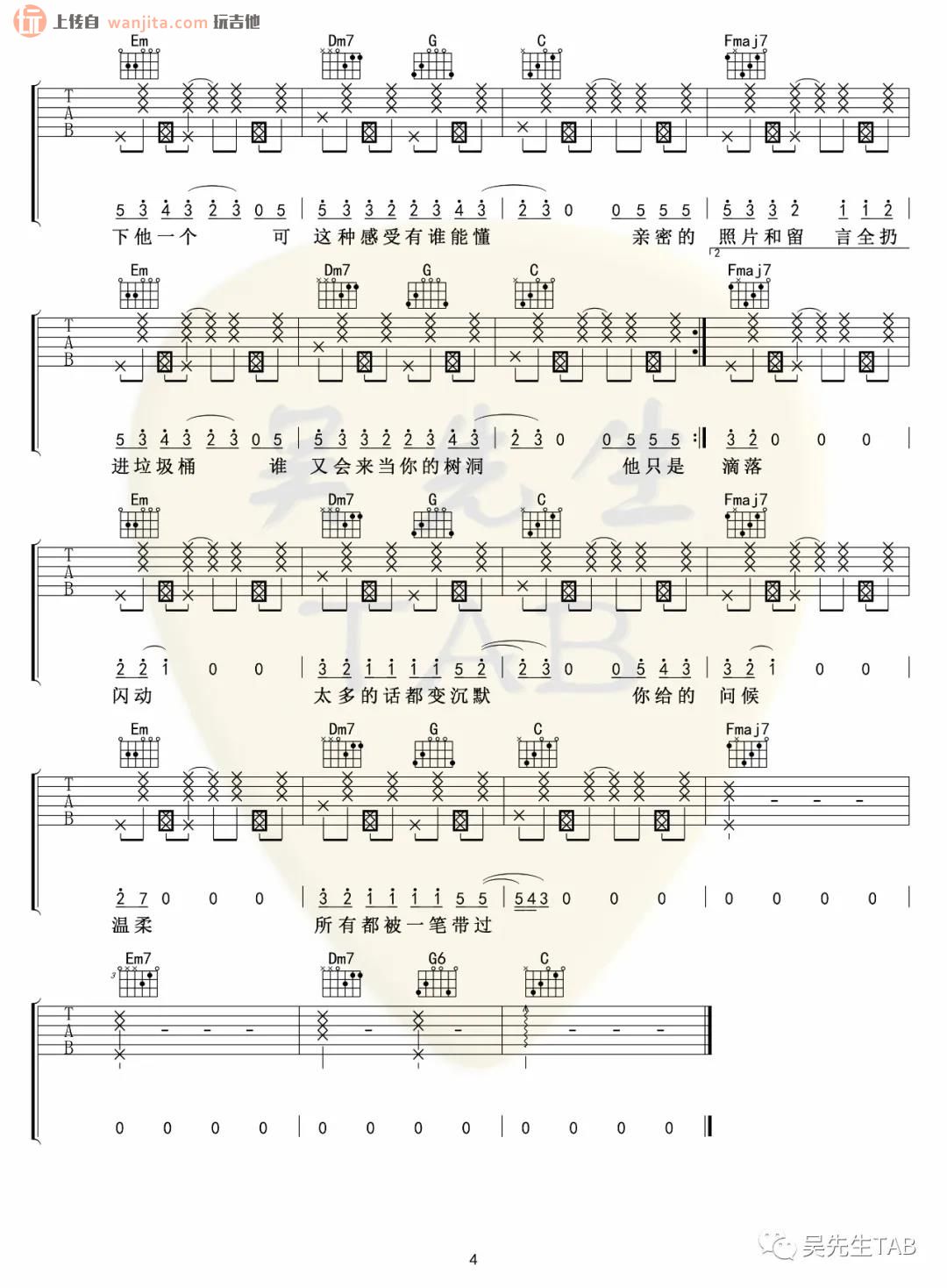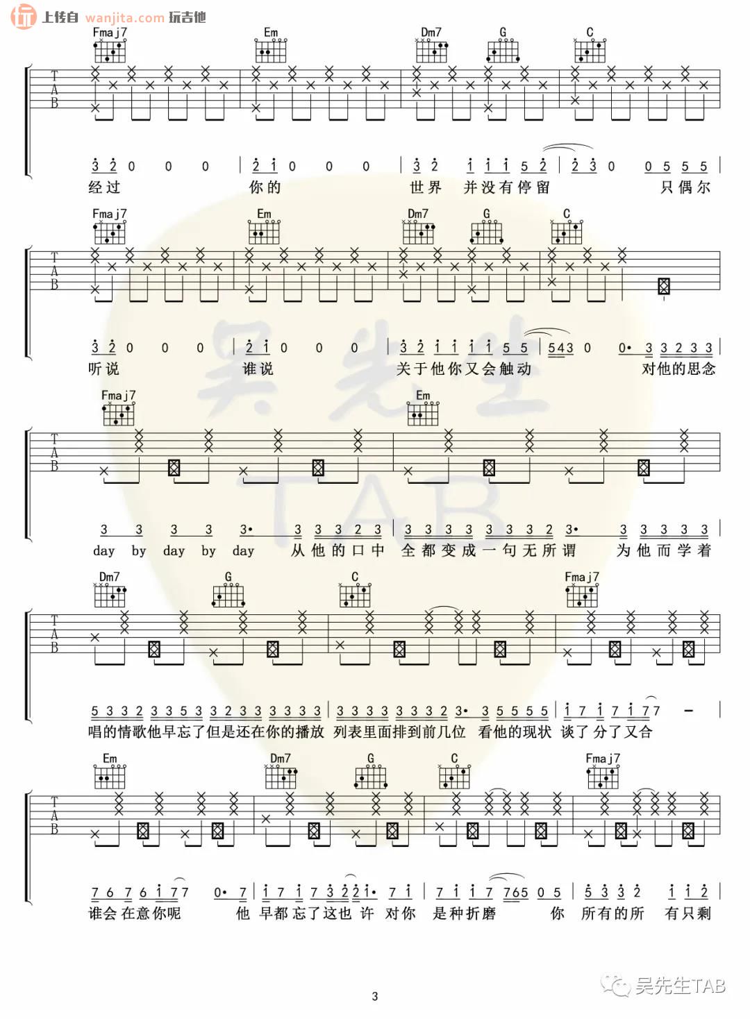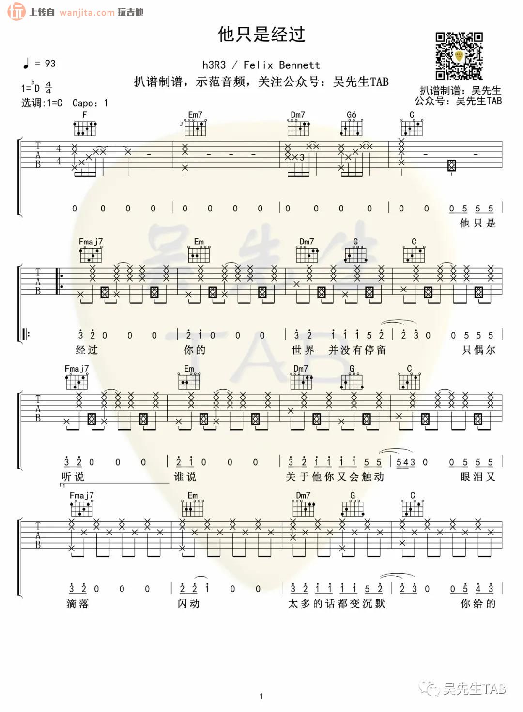 曲谱介绍: 《他只是经过》吉他谱_C调弹唱六线谱_Felix Bennett/h3R3,这首谱子由吉他自媒体吴先生编配,原调是bD调,选用C调指法,变调夹夹1品处可以弹唱原调,弹唱的难度不算很大,但是中间拍弦的节奏还是挺多,所以一定要掌握好拍弦的技巧,更加便于弹唱这首歌曲的节奏。