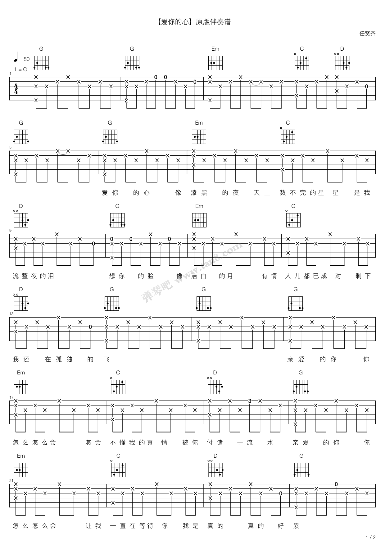 曲谱介绍: 《爱你的心》吉他谱,选用C调指法编配弹奏,适合新手弹唱练习,难度不大。
