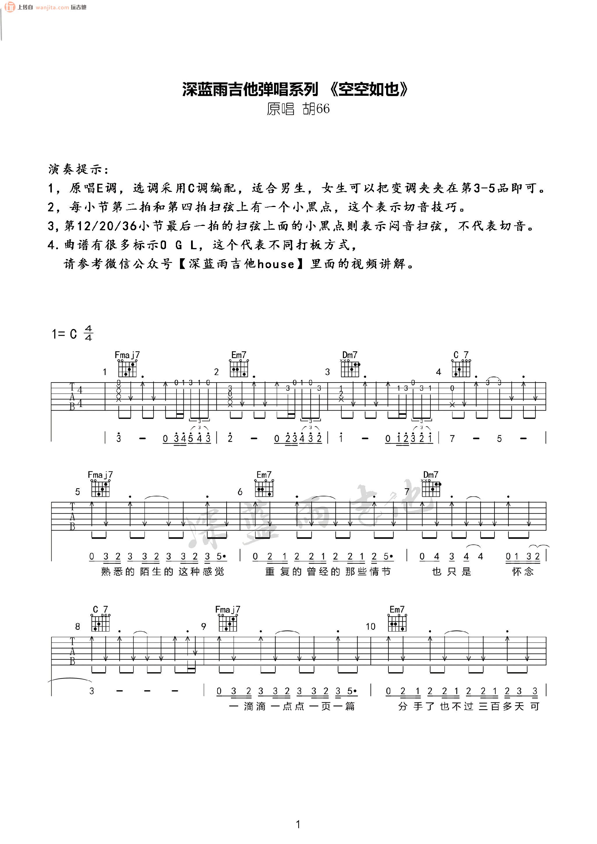 曲谱介绍: 胡66《空空如也》吉他谱_C调原版六线谱,原调是E调,这首C调指法女生需要将变调夹夹到3-5品,最好是根据自己音域决定。 这首曲谱由深蓝雨老师提供分享,包含了3张高清图片谱,曲谱是根据原版扒带,弹唱有一定难度,扫弦为主,中间有一些滞音的处理,以及拍弦的技巧,大家可以跟着视频参考学习后再练习,如果实在觉得有一些难度的同学,可以掌握扫弦+滞音的方式弹唱这首歌曲。 《空空如也》吉他弹唱视频教程