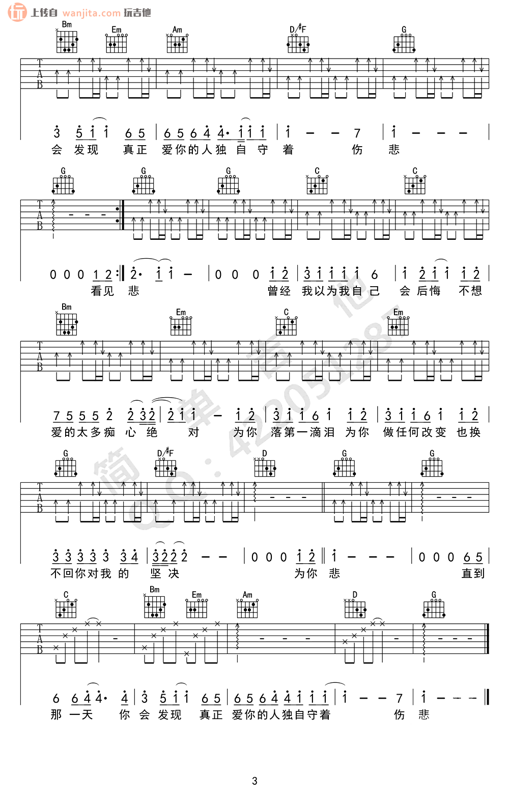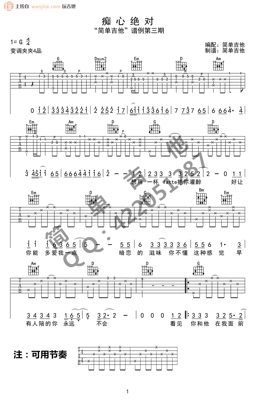 曲谱介绍: 《痴心绝对》吉他谱_G调原版六线谱_吉他弹唱谱,选用G调指法,变调夹可以夹4品,由于原版的音域偏高,大家可以根据自己的音域情况选择合适的变调夹位置,这首曲谱由简单吉他提供分享,玩吉他整理上传。