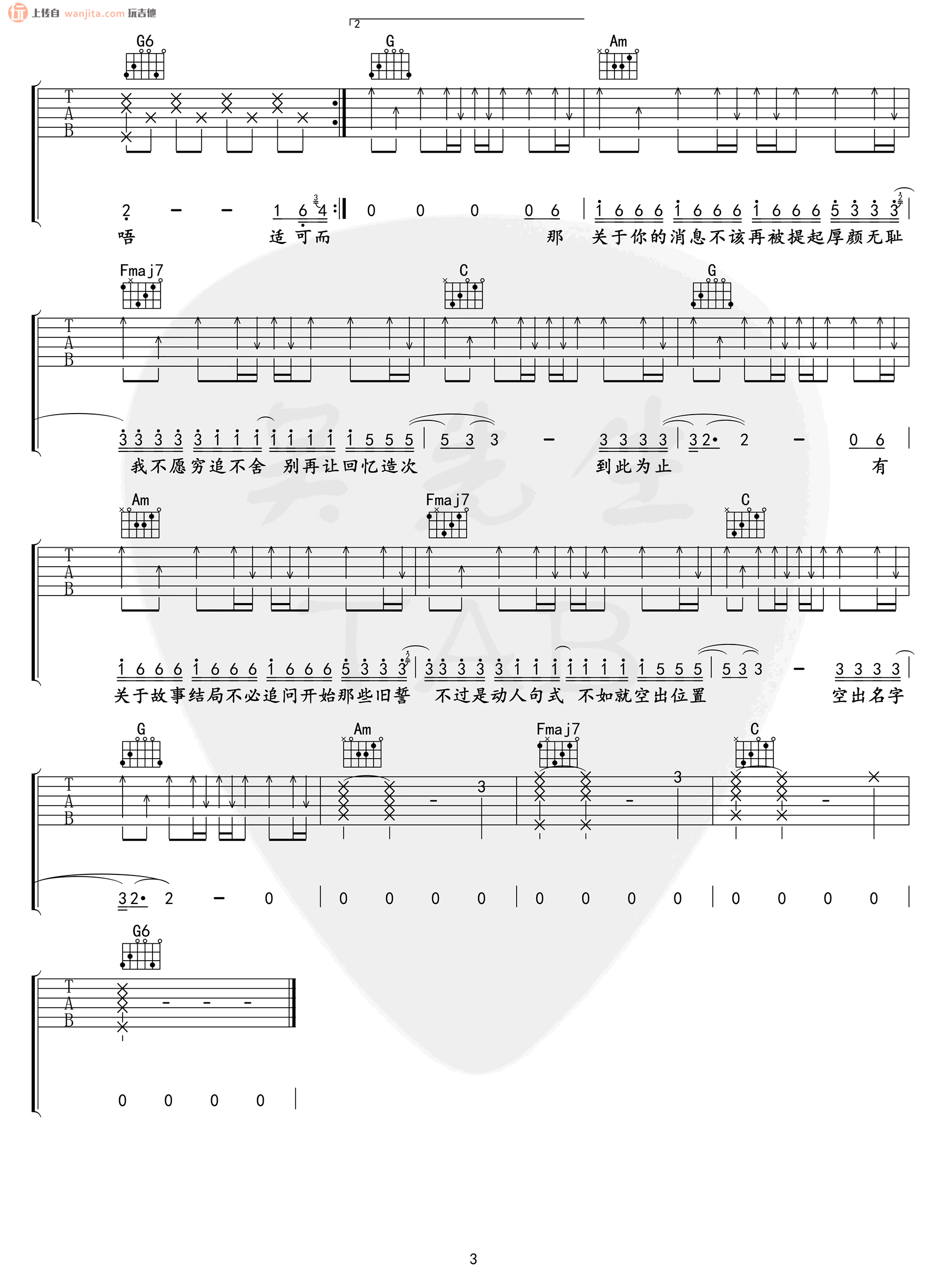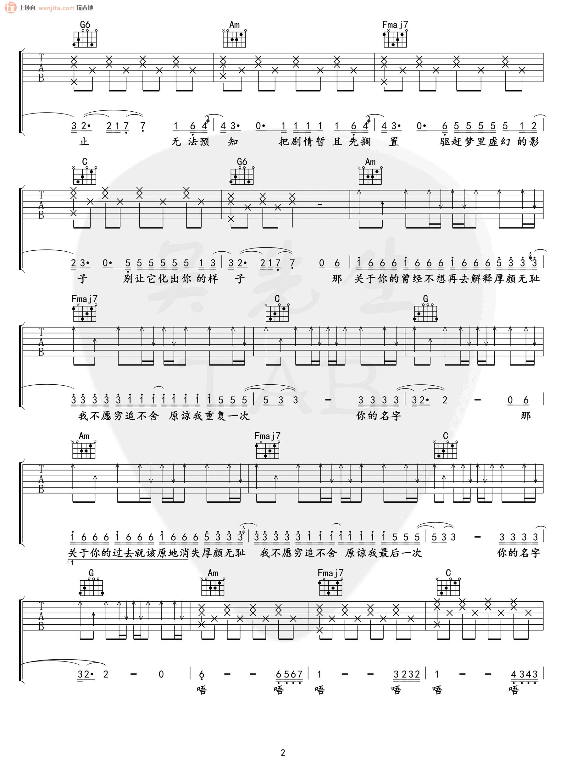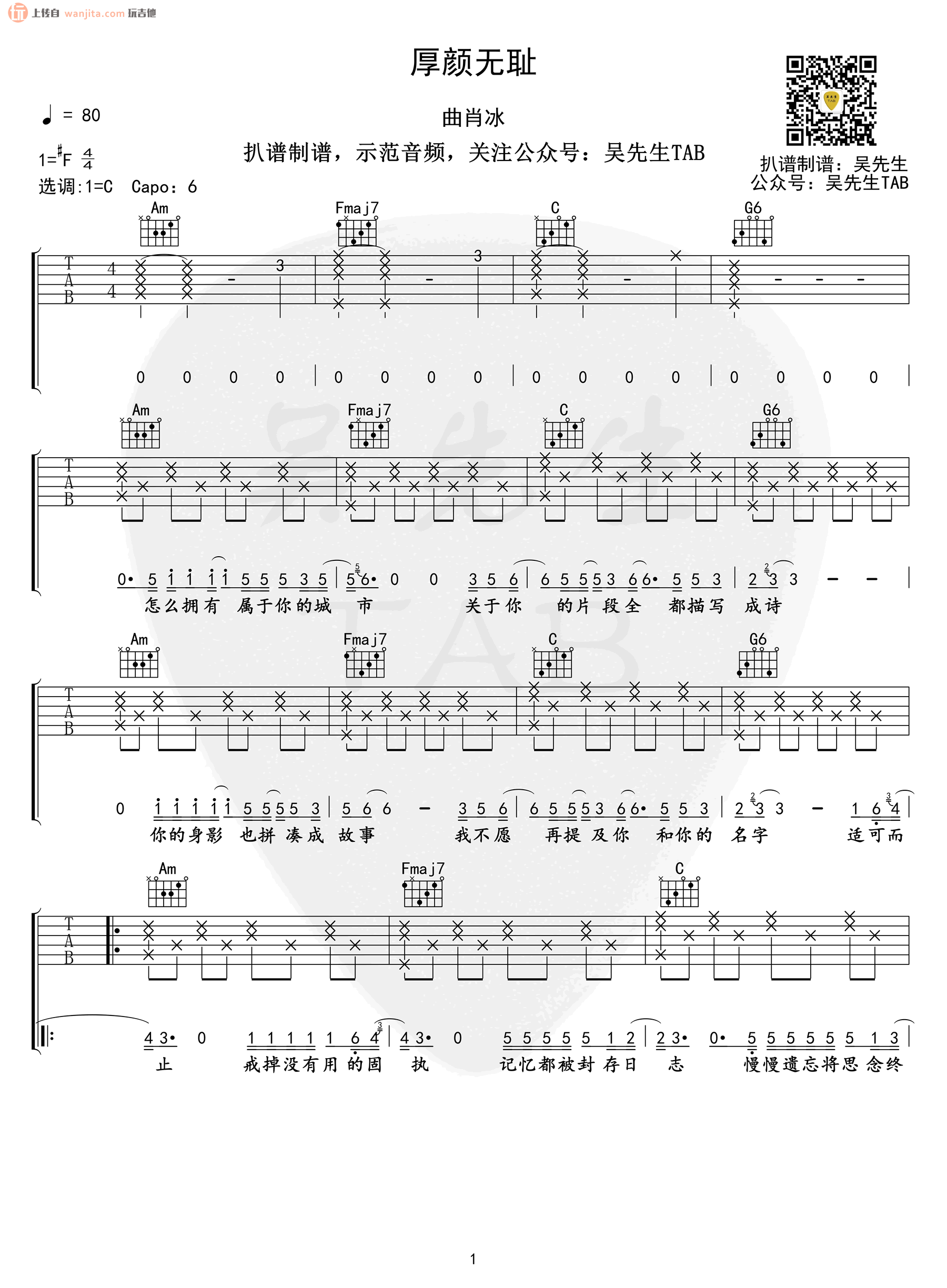 曲谱介绍: 《厚颜无耻》吉他谱_C调原版六线谱_吉他弹唱谱,自媒体达人吴先生分享此谱,玩吉他整理上传,原调是#F,选用C调指法弹唱,变调夹夹6品弹唱原调,如果男声版想弹唱此歌,可以根据自己的音域适当降低变调夹。