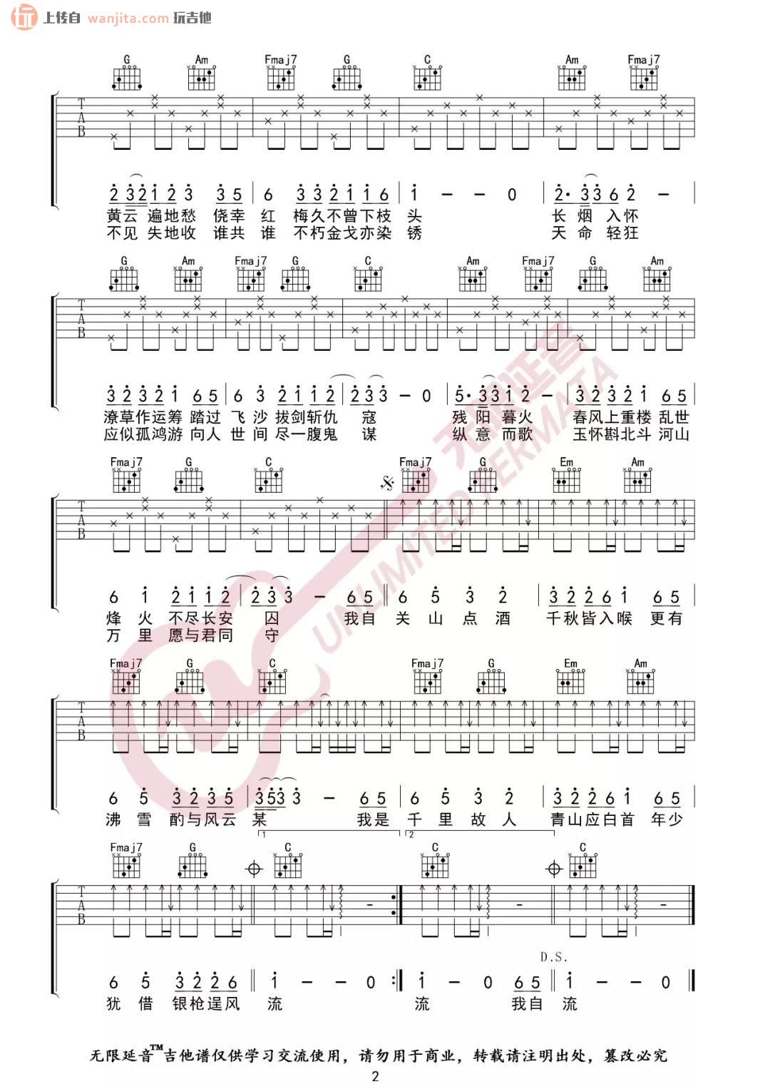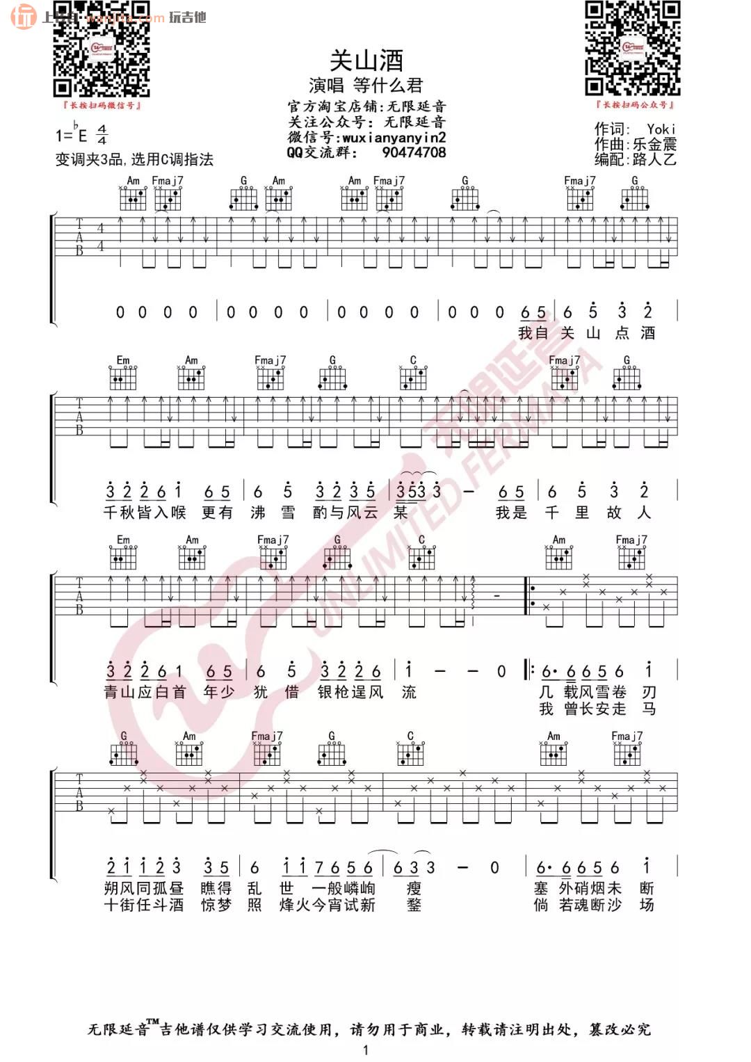 曲谱介绍: 《关山酒》吉他谱_C调原版六线谱_关山酒吉他弹唱谱,由无限延音提供分享,这首歌曲原调是bE,选用C调指法编配,弹唱难度不大,重点需要注意一些小节的和弦切换即可。