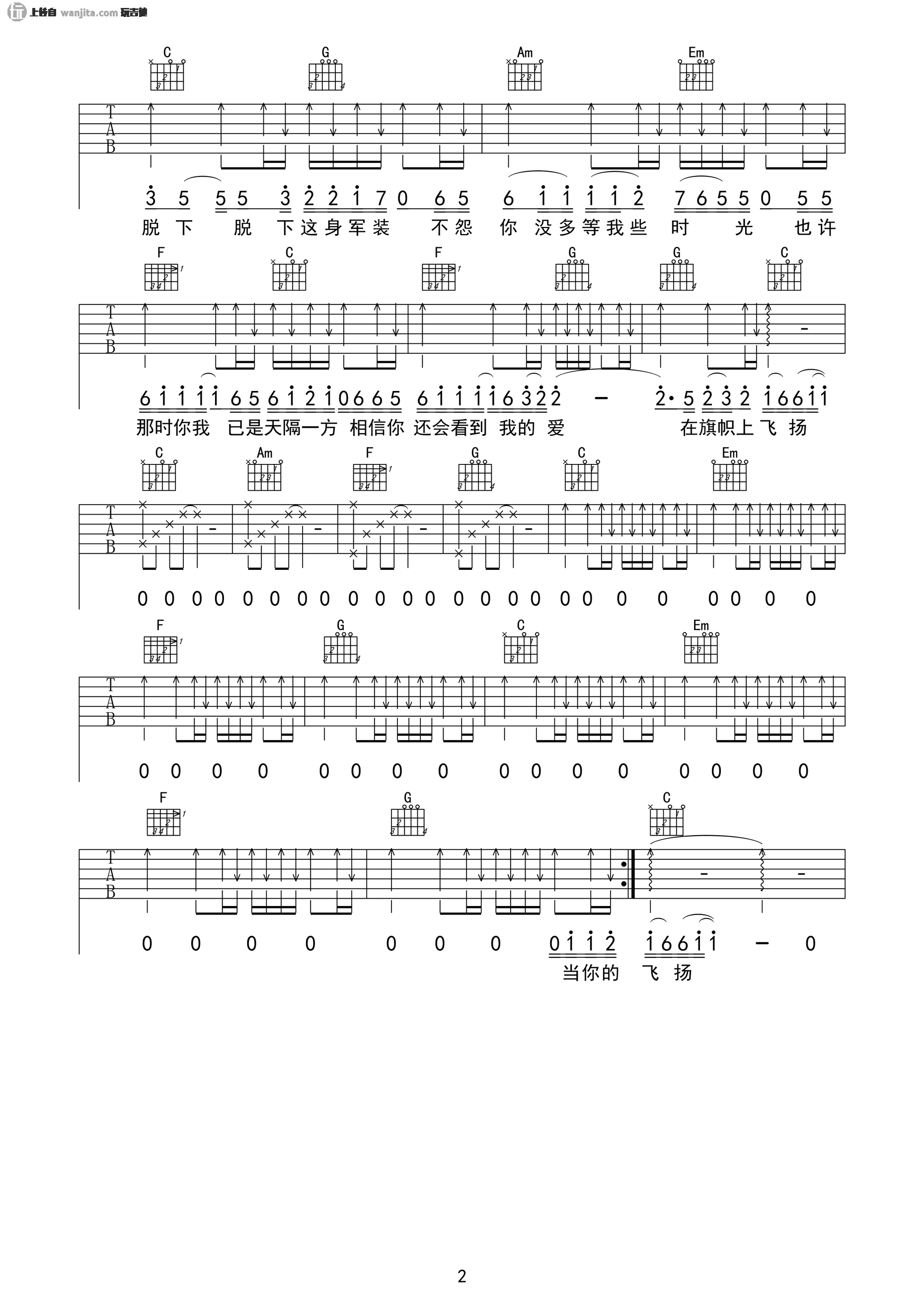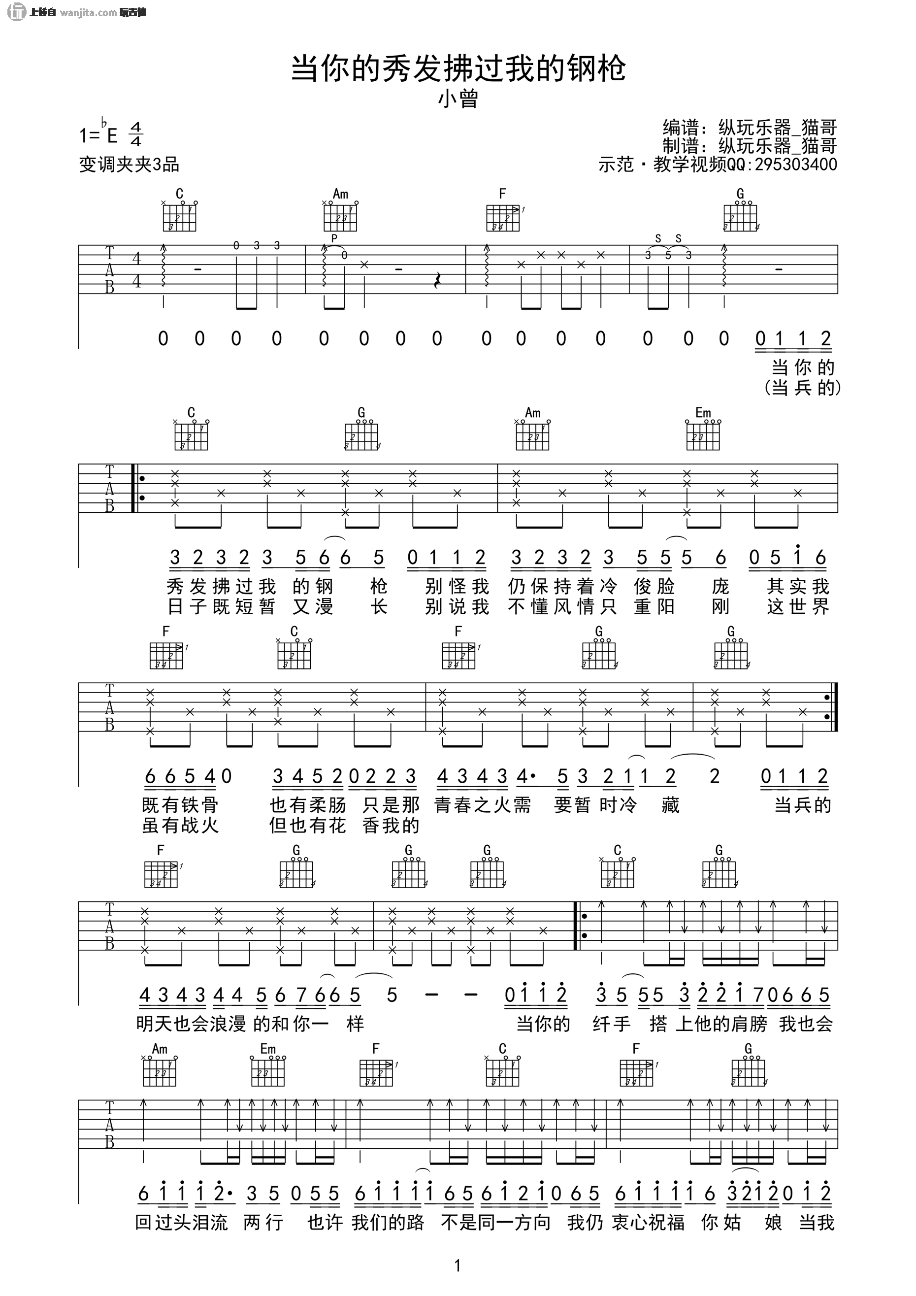 曲谱介绍: 《当你的秀发拂过我的钢枪》吉他谱_C调原版六线谱_高清图片谱,选用C调指法编配,原调是bE,夹3品可以弹唱原调,由纵玩乐器提供分享,玩吉他小编整理。