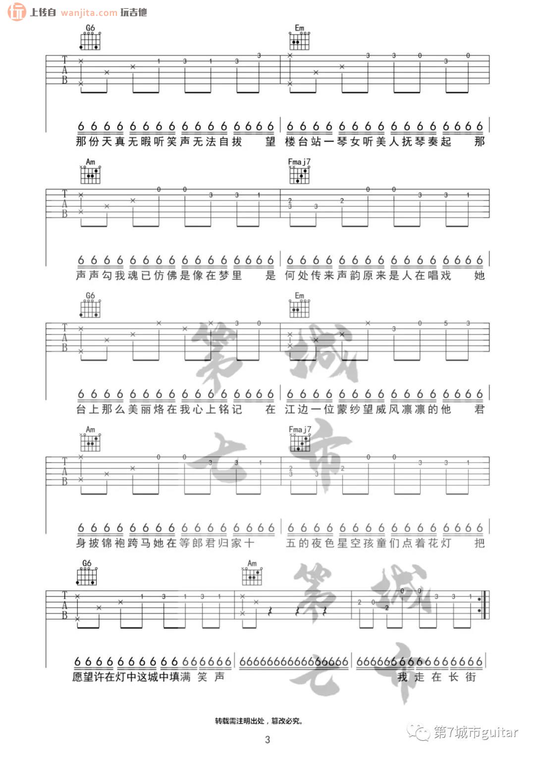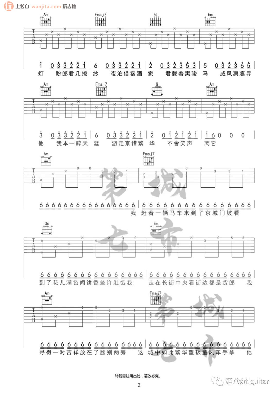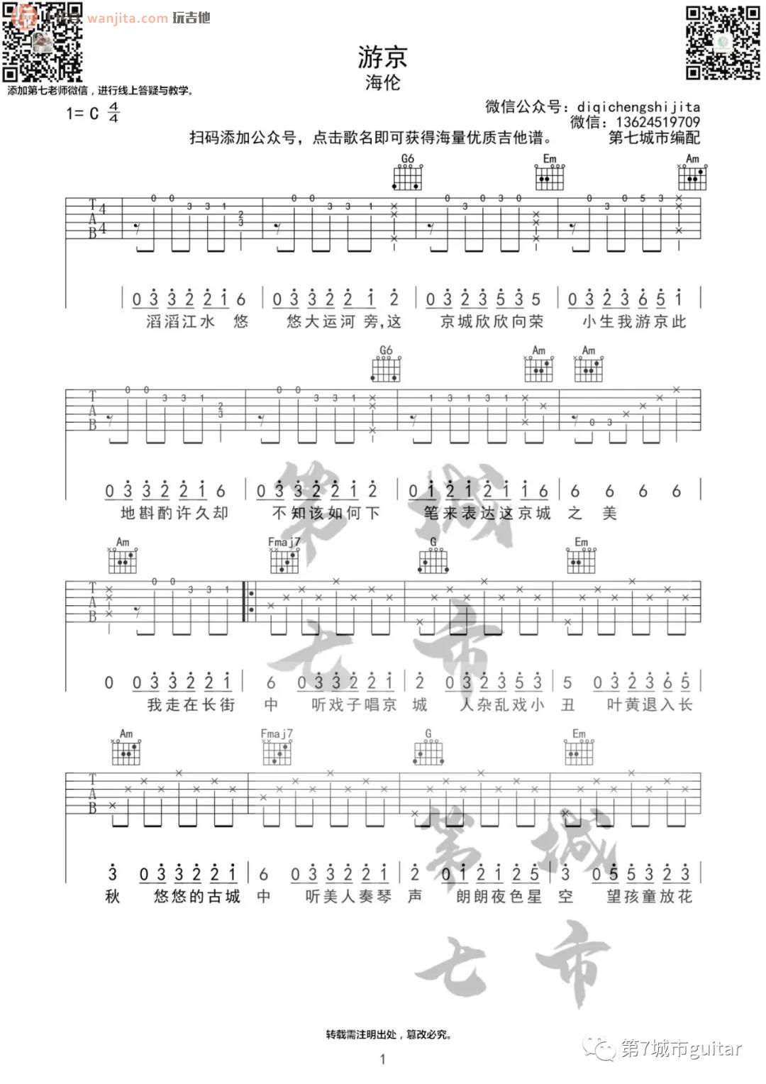 曲谱介绍: 《游京》吉他谱_C调原版六线谱_游京吉他弹唱谱,这个谱子由第七城市编配并分享,选用的C调指法,版本不复杂,新手也能够很好的弹奏这首歌曲。