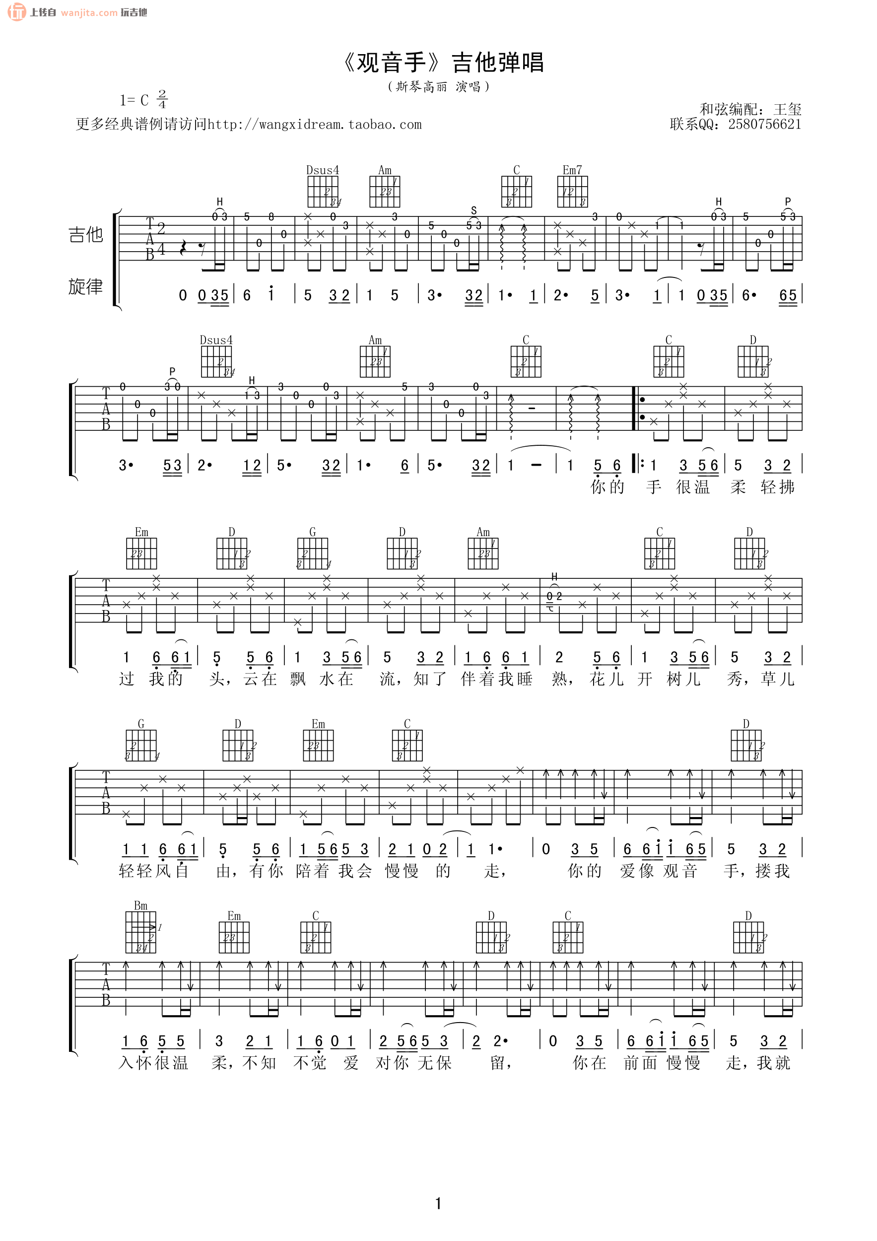曲谱介绍: 观音手吉他谱_C调原版六线谱_高清图片谱,这个谱子选用C调指法编配,包含了完整的前奏伴奏部分,有一定难度,需要花点心思去掌握这首歌曲。