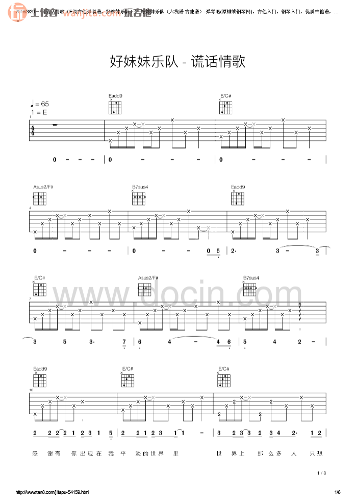 曲谱介绍: 《谎话情歌》吉他谱_E调原版六线谱_吉他弹唱谱,选用E调指法编配,曲谱比较完整,总共8张高清图片谱,弹唱起来难度适中,需要大家花时间消化熟练。