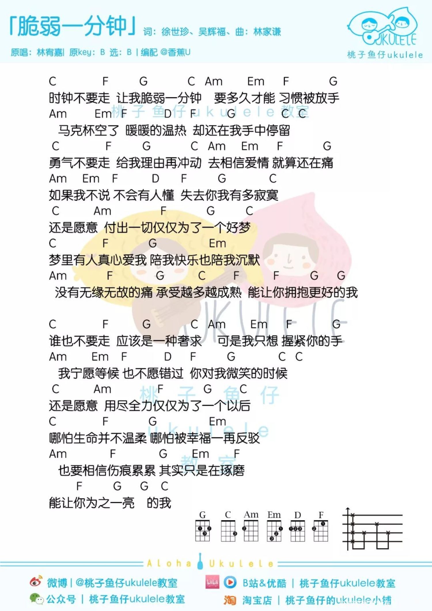 曲谱介绍: 最近听到了林宥嘉的新歌《脆弱一分钟》。 听到了第一句,小编就点了小红心。 “时钟不要走,让我脆弱一分钟” 一分钟,六十秒。 在难过的时候很长, 在快乐的时候又很短。 ▌《脆弱一分钟》是电视剧《爱情进化论》的片头曲,让我感触最深刻的就是最后奋勇飞翔的那句“还是愿意,用尽全力仅仅为了一个以后”。   《脆弱一分钟》尤克里里谱