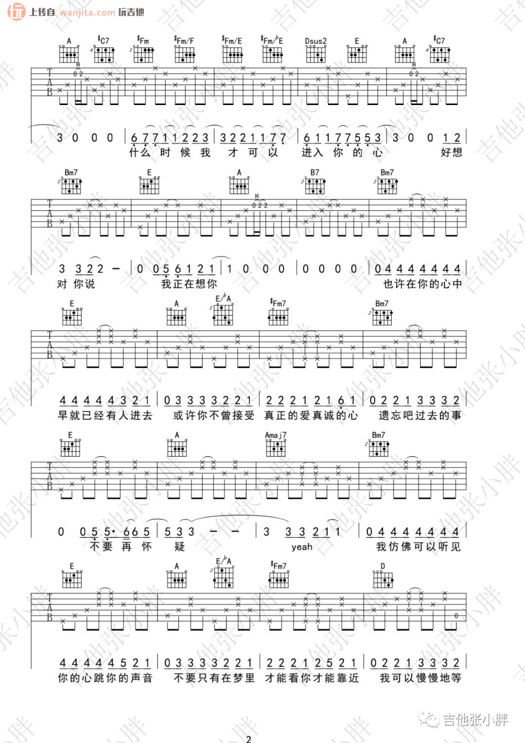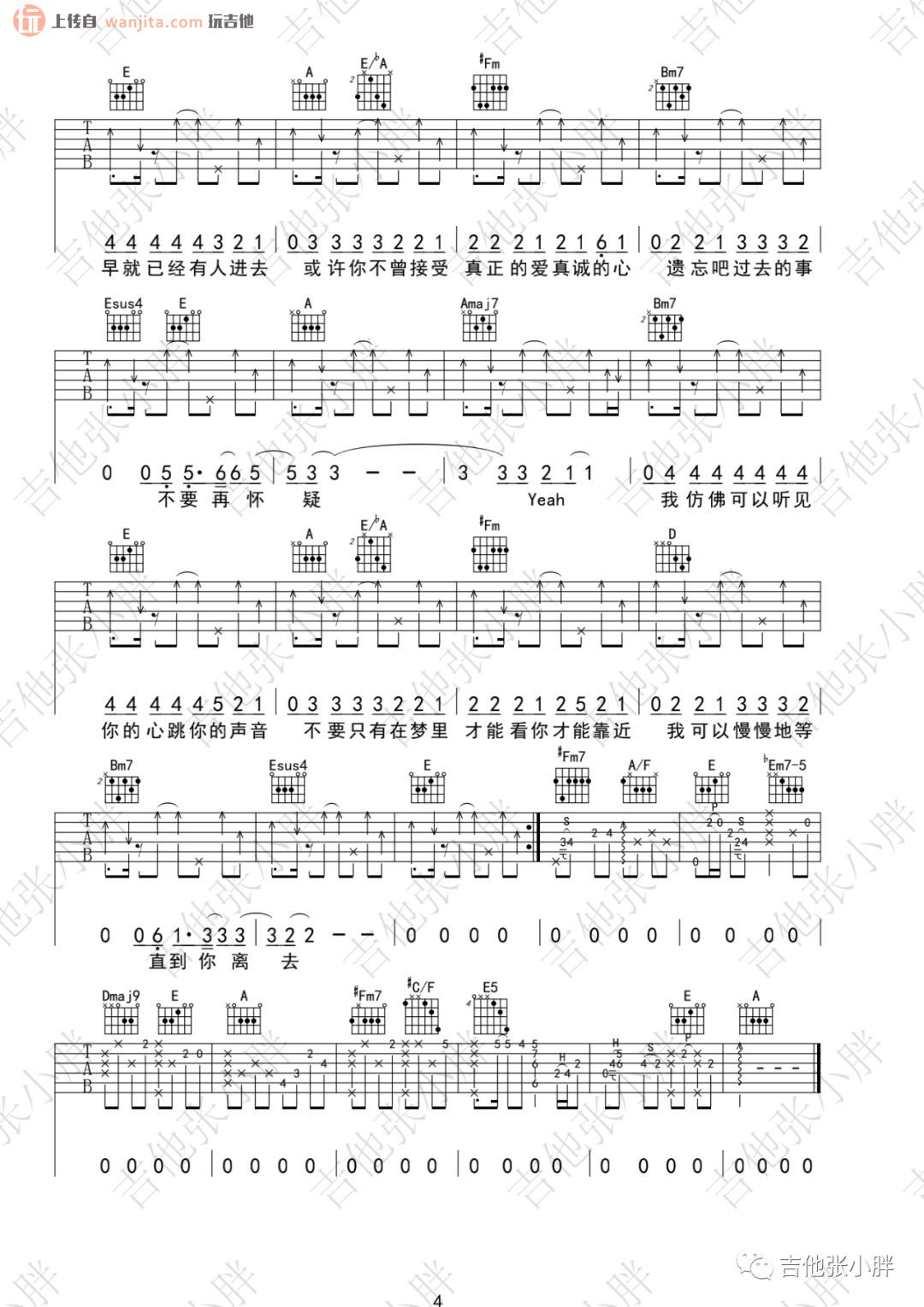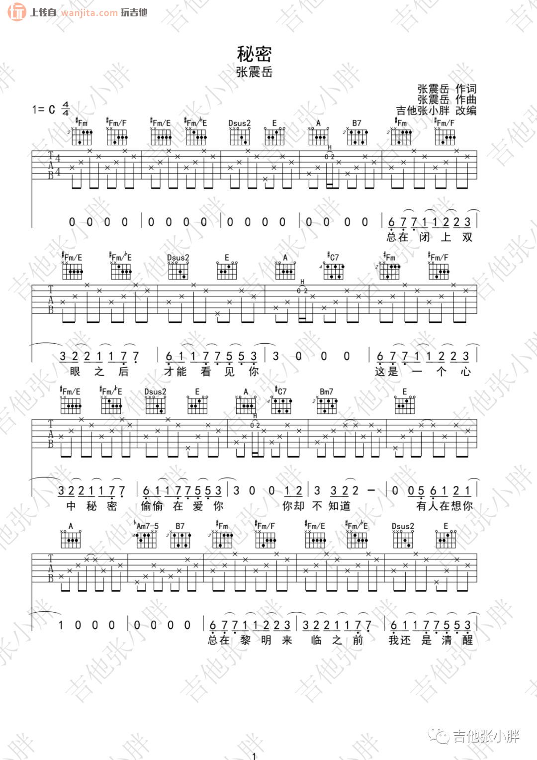 曲谱介绍: 张震岳《秘密》吉他弹唱视频 《秘密》吉他谱由张小胖制谱分享,玩吉他上传。总共4张高清图片谱,编配非常的完整,选用C调指法,整个曲谱接近原版,所以需要花一定时间去练习消化,以便熟练掌握弹唱。