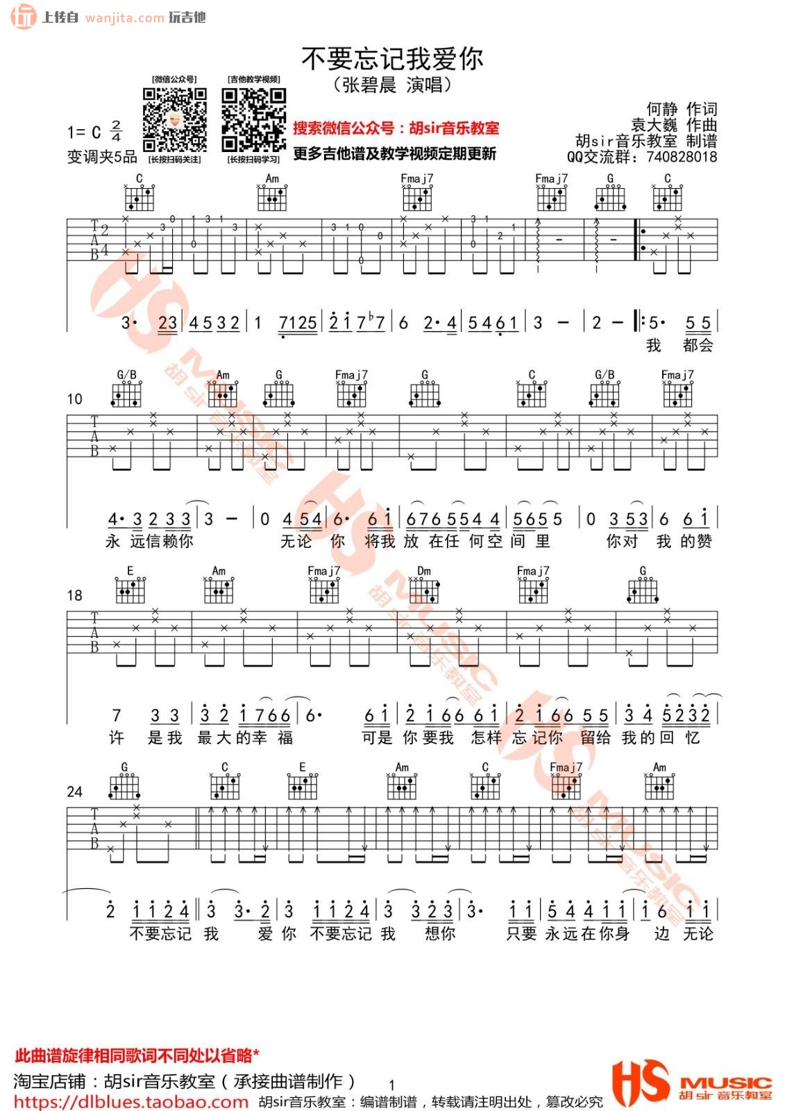 曲谱介绍: 《不要忘记我爱你》吉他谱,原调是F调,选用C调指法,由胡SIR编配制谱,变调夹大家可以夹在5品弹唱原调,整个谱子按照原版编配,难度适中,喜欢的朋友不要错过。
